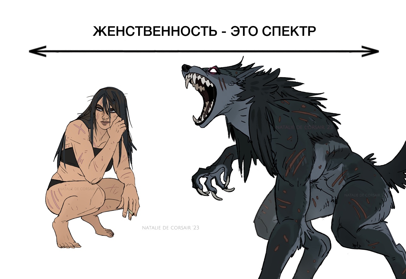 Ещё мой любимый мотив это оборотничество, когда персонаж может по своему желанию (а иногда и без) переключаться между человеческим и звериным обликом, при этом по каким-то причинам предпочитает конкретную форму