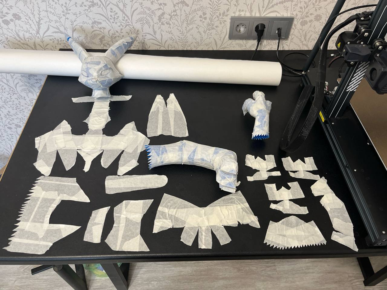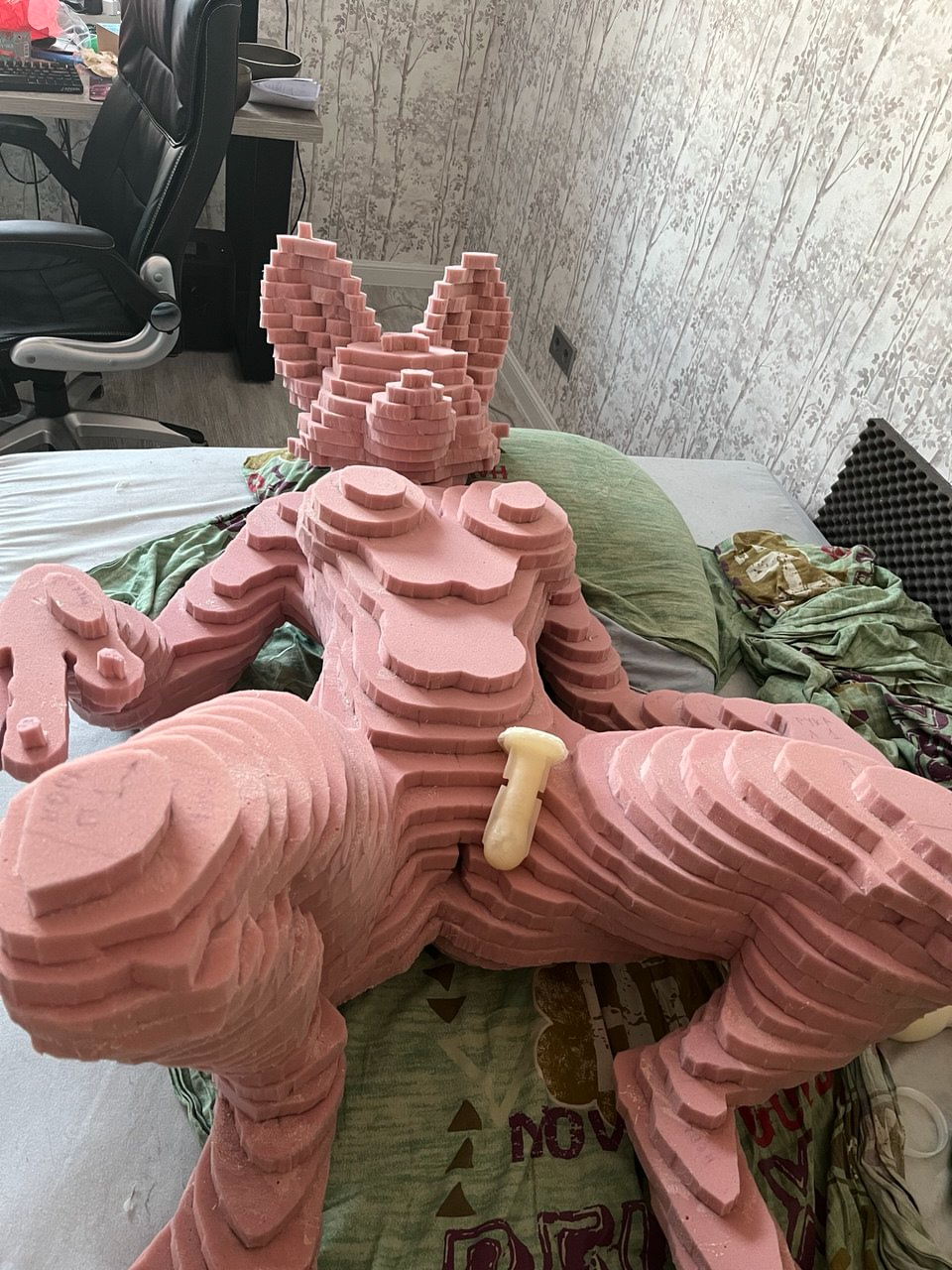 сегодня вырезал то что наразмечал. И попробовал снять раскройку с ноги. Нихуя не вышло. Очень сложная форма... Завтра еще раз попробую. Возможно придется менять или сильно упрощать лапы и голову. Видимо то что с трудом разрезает плюшифай так же с трудом и человек правильно разметит. Если вообще возможно сделать адекватнуб разметку, чтобы модель не была похожа на франкенштейна. Ну или материал другой брать - тянущийся какой-нибудь... но мне не нравится идея.