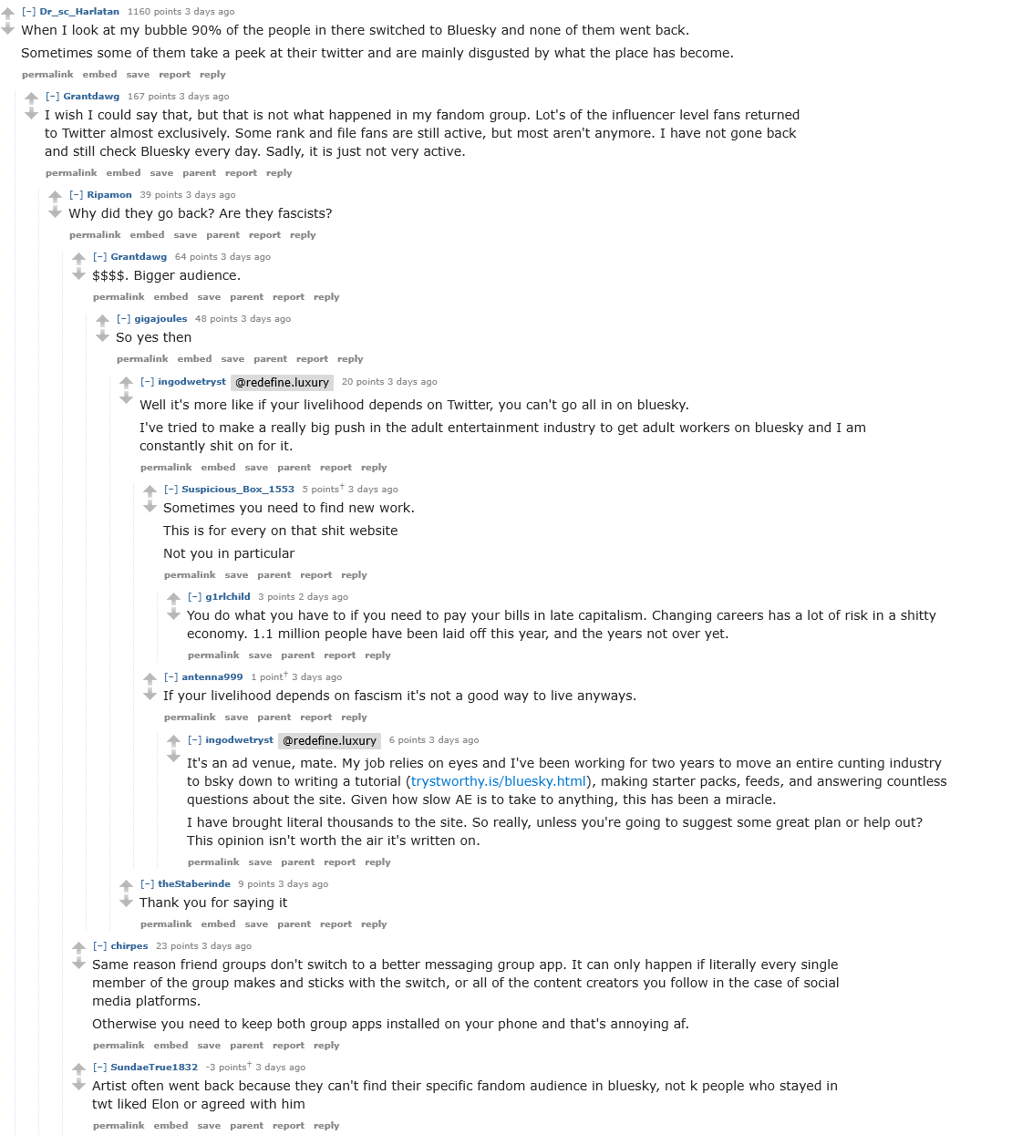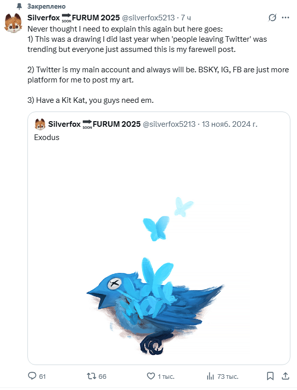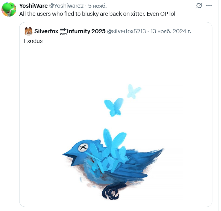 >>427824 Уж не знаю чего ты там творишь со своей проксёй и фингерпринтнутым браузером. Я вкатися в блюсик достаточно рано, когда ещё были инвайты полгода сидел в wait-листе и ждал свой заветный, и когда мало кто вообще мог там регистрироваться, так что массовый exodus с Х пока ещё не начался. Перекатился вслед за особо радикальными художниками, которые ещё и свою учётку на X неосмотрительно снесли, после чего их %USERNAME% быстро закиберксвотили всякие скаммеры. В целом мог бы закатиться обратно на X, если бы там пару месяцев назад не ввели анальные возрастные ограничения с обязательным документальным подтверждением благо есть Xcancel и подобные альтернативыне фронтенды вроде Nitter, с этим не так всё плохо