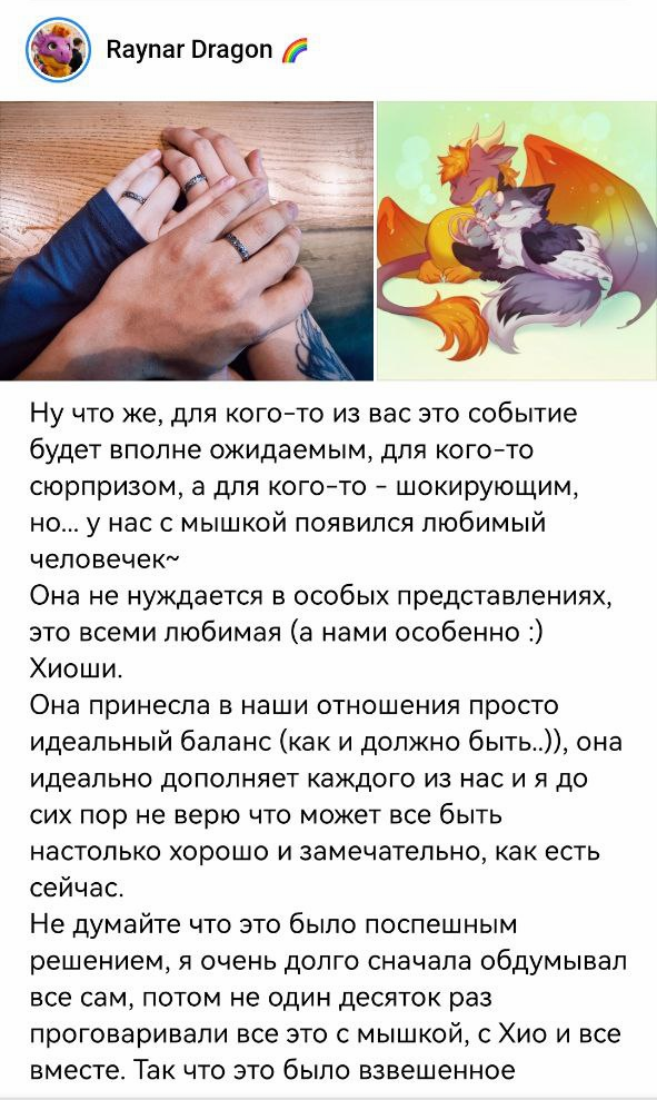 >>428311 Рисовака образовала семейный тройничок с парой фурфагов, набила тату их персов на своей тушке, все трое носят обручальные кольца, радостно няшатся под пледиком и очень довольны. Возможно, у них будет хороший потенциал для драмы, но потом.