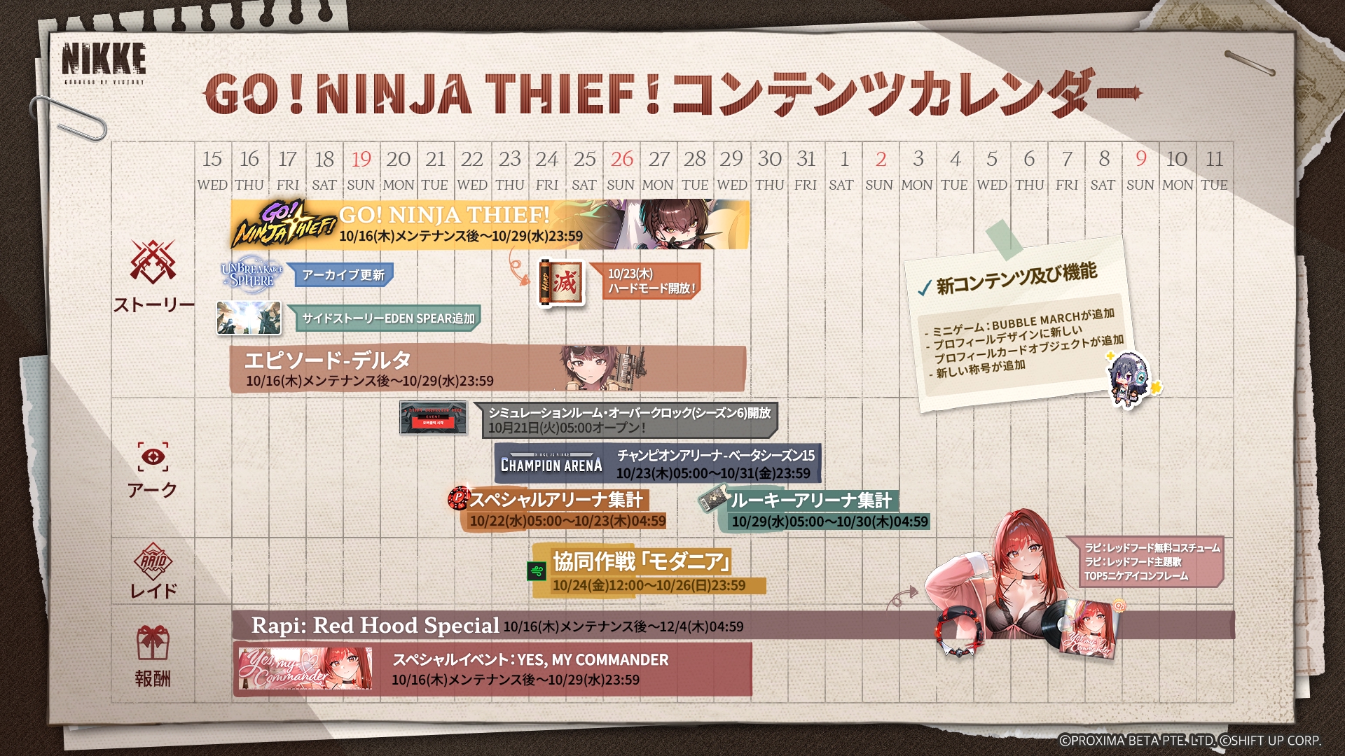 Тред ивента GO! NINJA THIEF!, в котором к Фантомным ворам Справедливости присоединяется Дельта - тайманин ниндзя, а шкикан переодевается в белый костюм. Доступна новая стори про костюм Рапи - Rapi Red Hood Special, а так же бонусы. Доступна новая сайд стори про Нихилистер - Eden Spear.