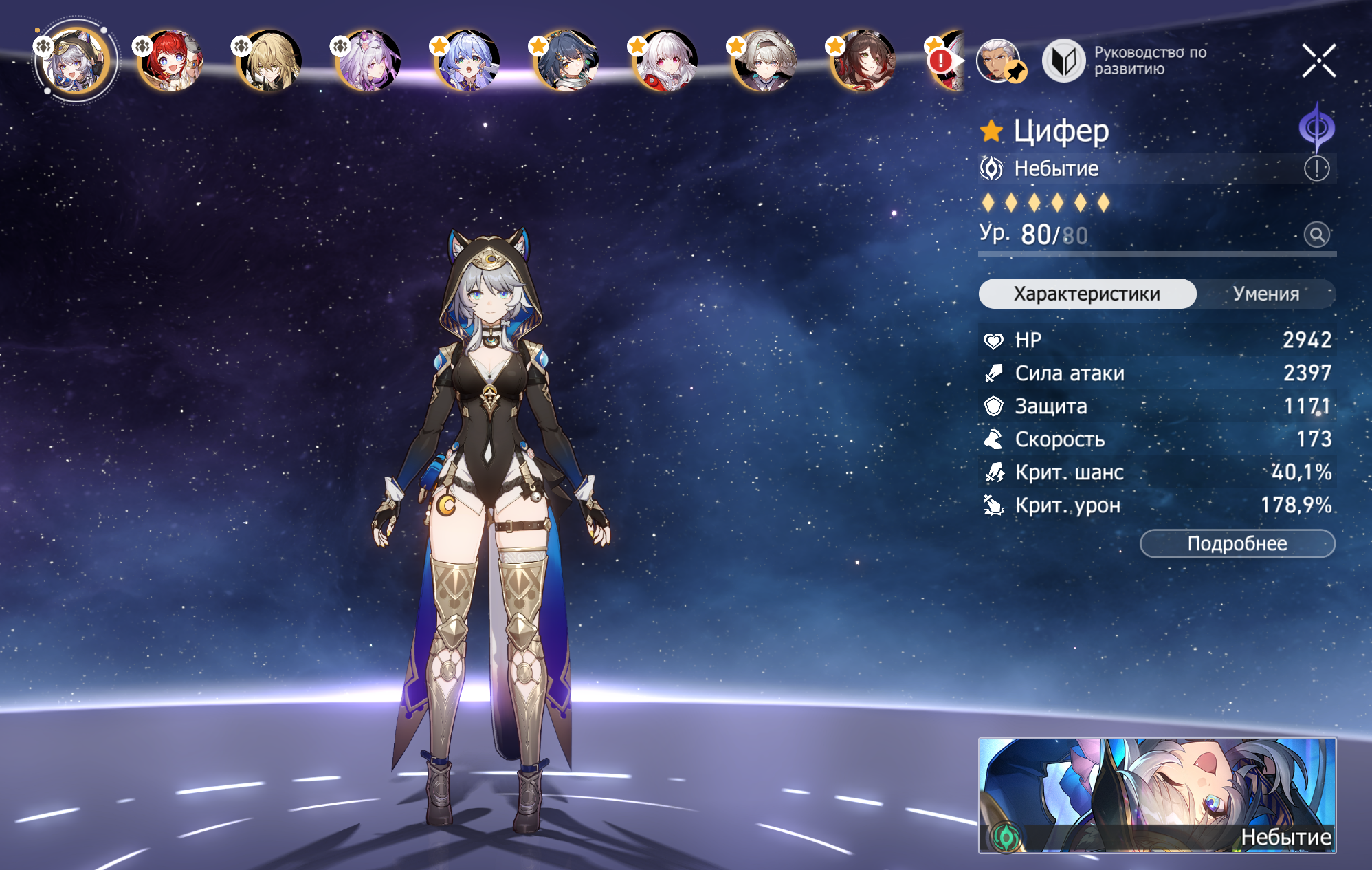 Цифер 100% лучшее, что я крутил за последний год. Мало того, что Ахерон с могилы подняла, так ещё и ощущается везде полезной. Но сори, у Ляо свои планы на пачкостроение, поэтому универсальные чары тут не приветствуются. А мне похуй, я за долгие месяцы кайфую от игры на Дыне. Кошка спасла эту ебучую помойку.