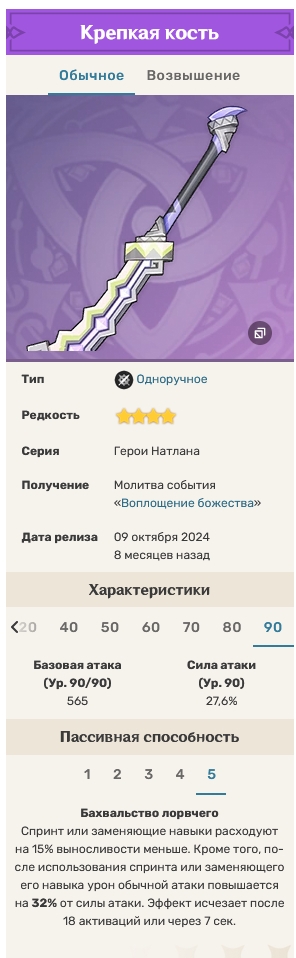 А по факту, норм 4 зв мечей для дамагера и нет, везде как-то невнятно. Неплохо выглядит БП, может быть черногор, хотя там пассивка практически не срабатывает же, потом ивент, хотя опять же КШ дадут только под щитом, ну и вот эта палка убивалка, с виду не сильно крутой, но и не полный мусор. Впрочем, не уверен, что полеты на ешке считаются спринтом для активации. Крафт Фонтейна не оч, долг жизни душит