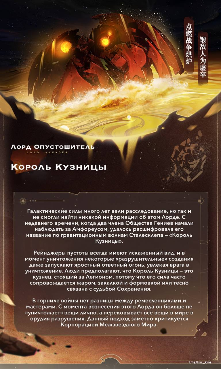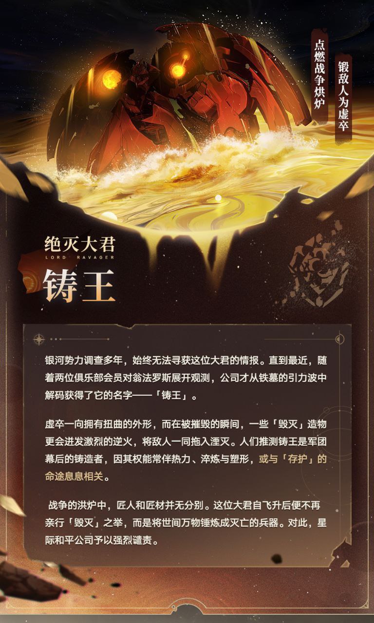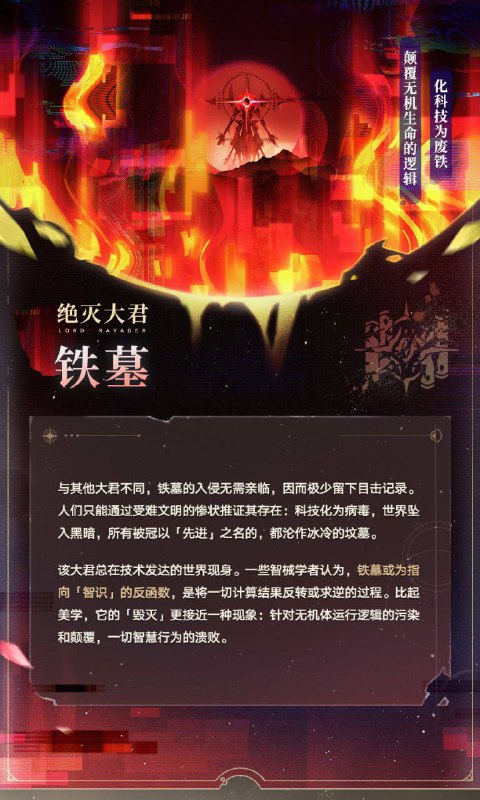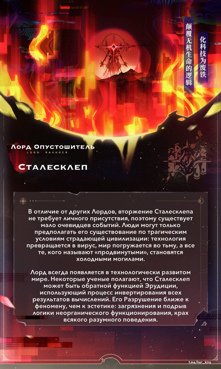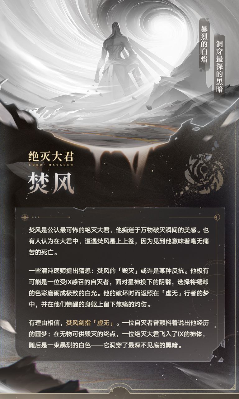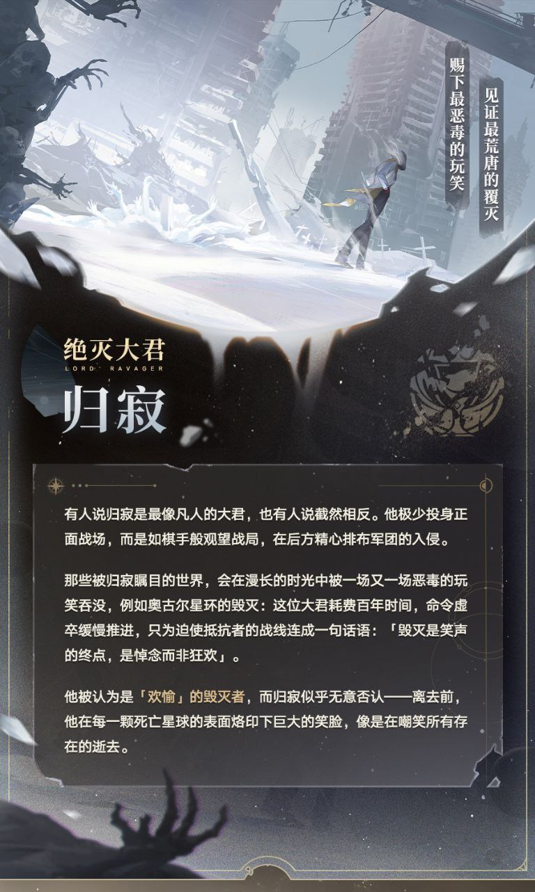 绝灭大君(Лорды-Опустошители) 贯彻万物归熵的毁灭美学(Воплощающее эстетику Разрушения, где всё сущее возвращается к энтропии) 纳努克擢选的毁灭兵器(Избранное Нануком оружие Разрушения) 行于毁灭命途的星神纳努克(Звёздный бог Нанук, идущий Путём Разрушения),为各个世界上萌生毁灭冲动的强大生物投去一瞥(бросил взгляд на могучих существ во всех мирах, в ком родился импульс Разрушения),并为其烙下印记(и запечатлел на них свою метку),赐予力量(дарующую силу)。
