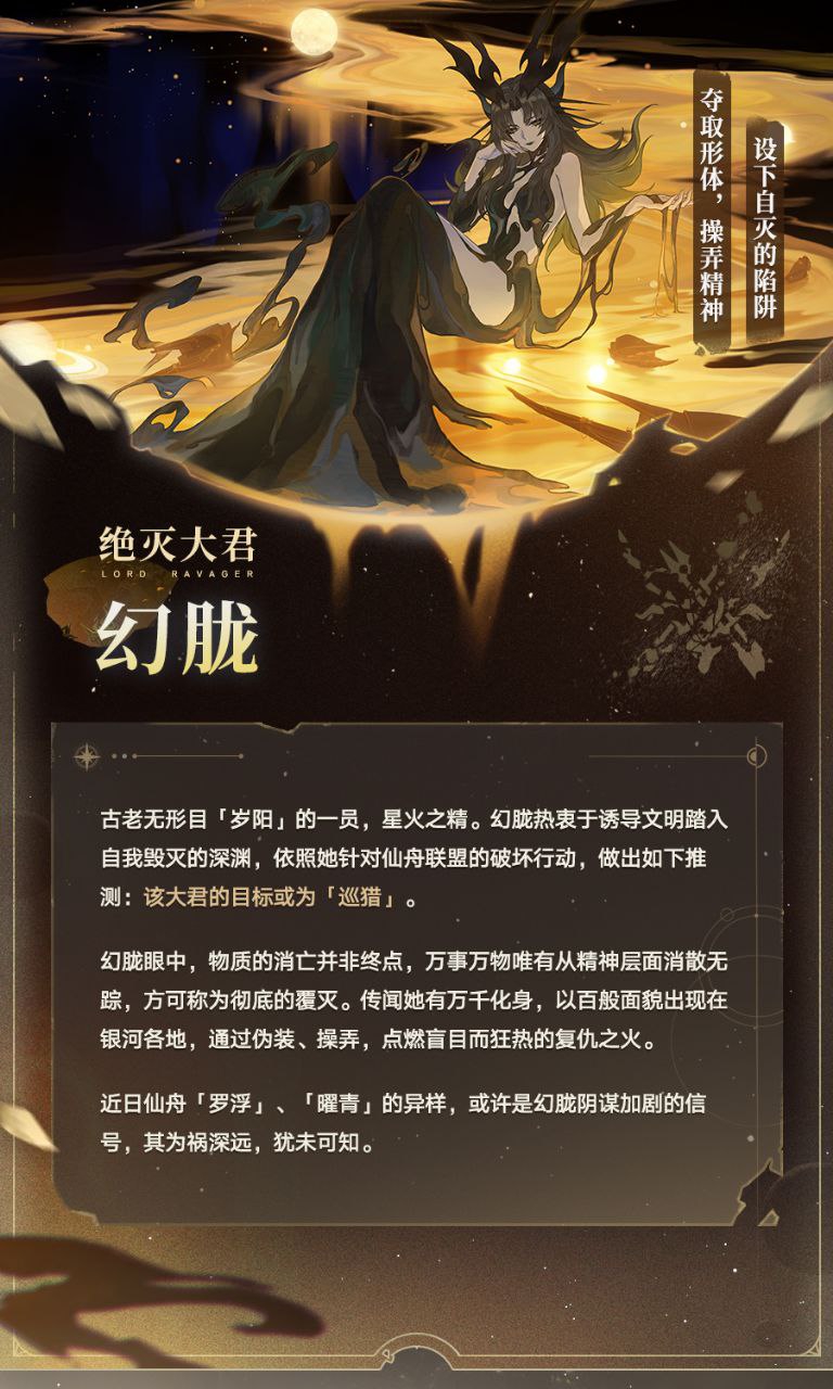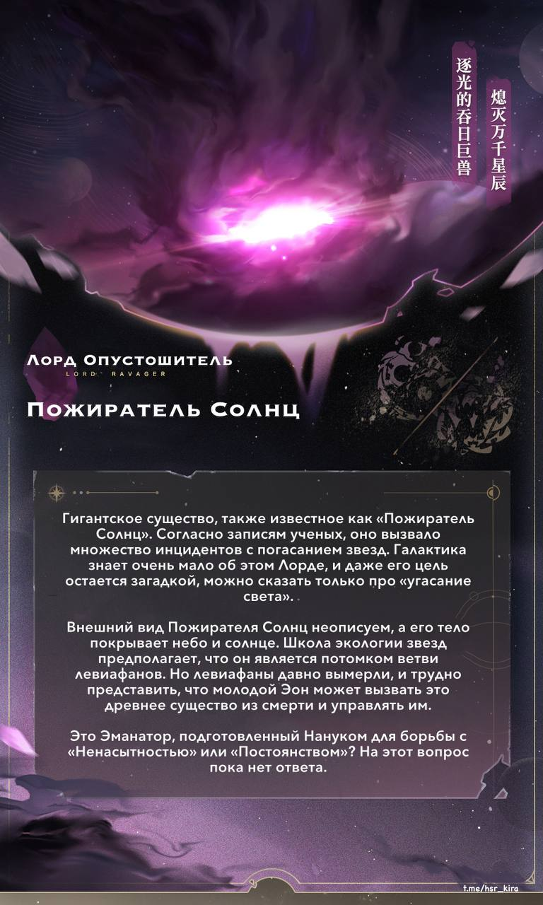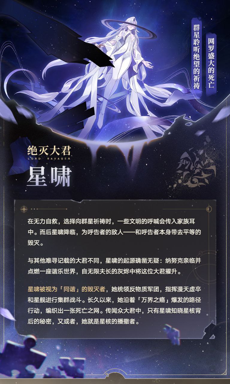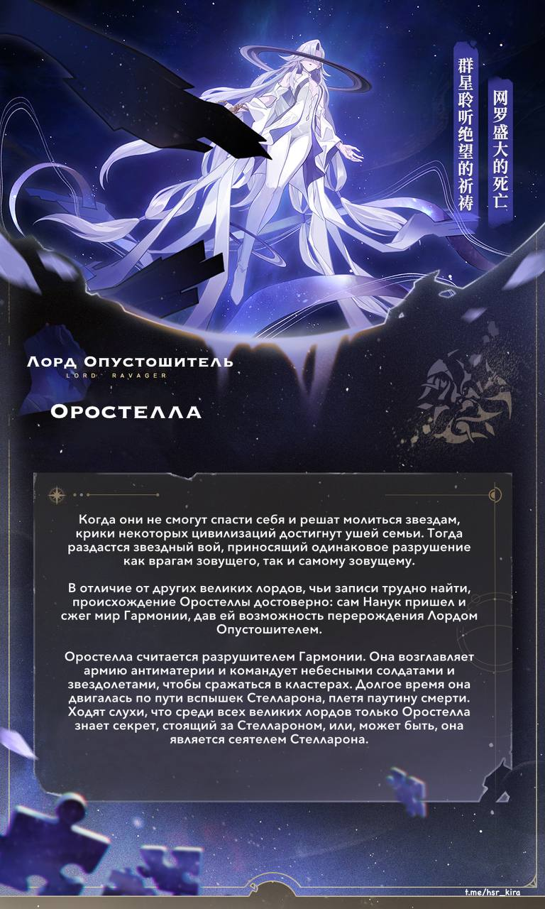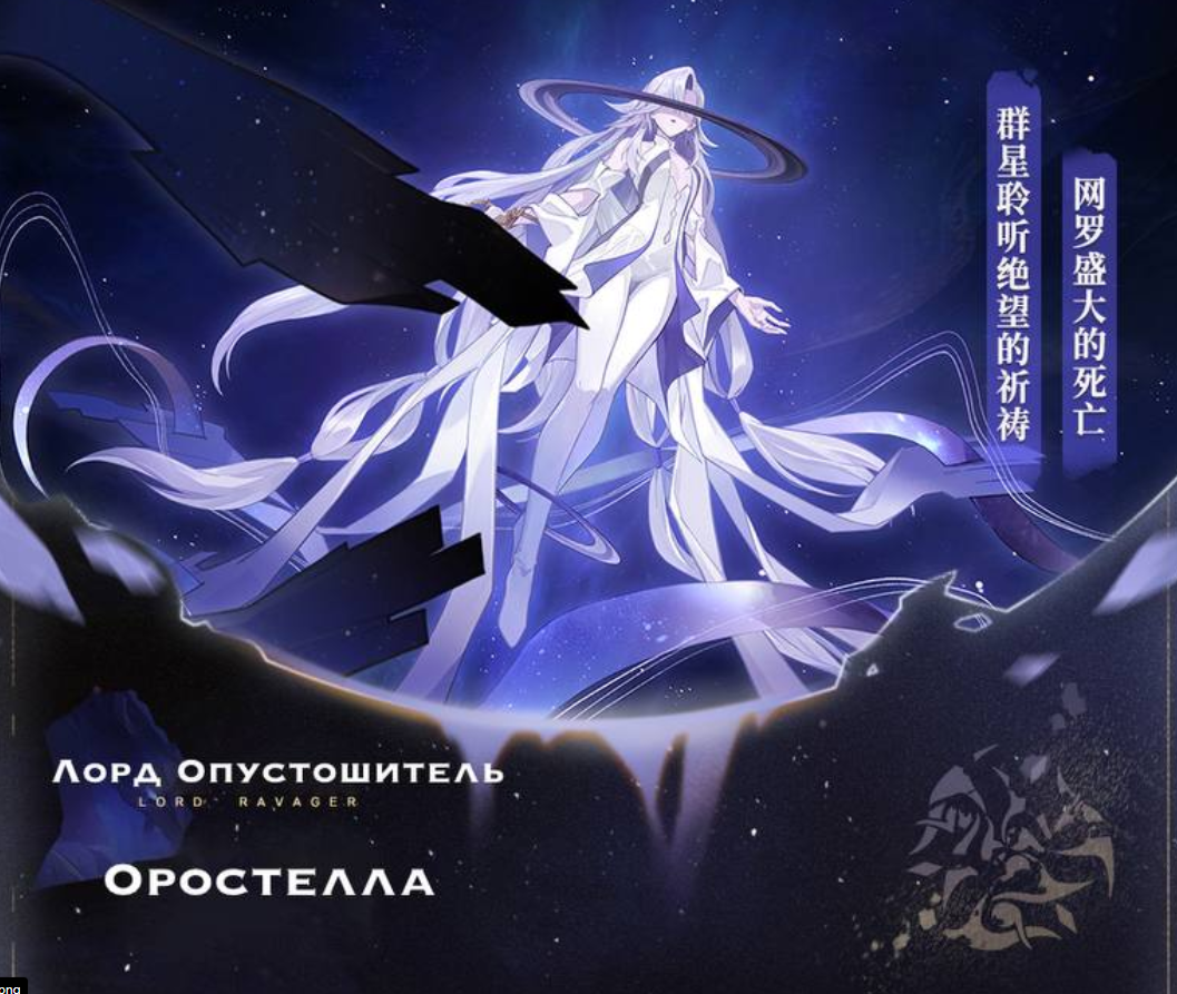 绝灭大君(Лорды-Опустошители) 贯彻万物归熵的毁灭美学(Воплощающее эстетику Разрушения, где всё сущее возвращается к энтропии) 纳努克擢选的毁灭兵器(Избранное Нануком оружие Разрушения) 行于毁灭命途的星神纳努克(Звёздный бог Нанук, идущий Путём Разрушения),为各个世界上萌生毁灭冲动的强大生物投去一瞥(бросил взгляд на могучих существ во всех мирах, в ком родился импульс Разрушения),并为其烙下印记(и запечатлел на них свою метку),赐予力量(дарующую силу)。