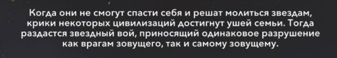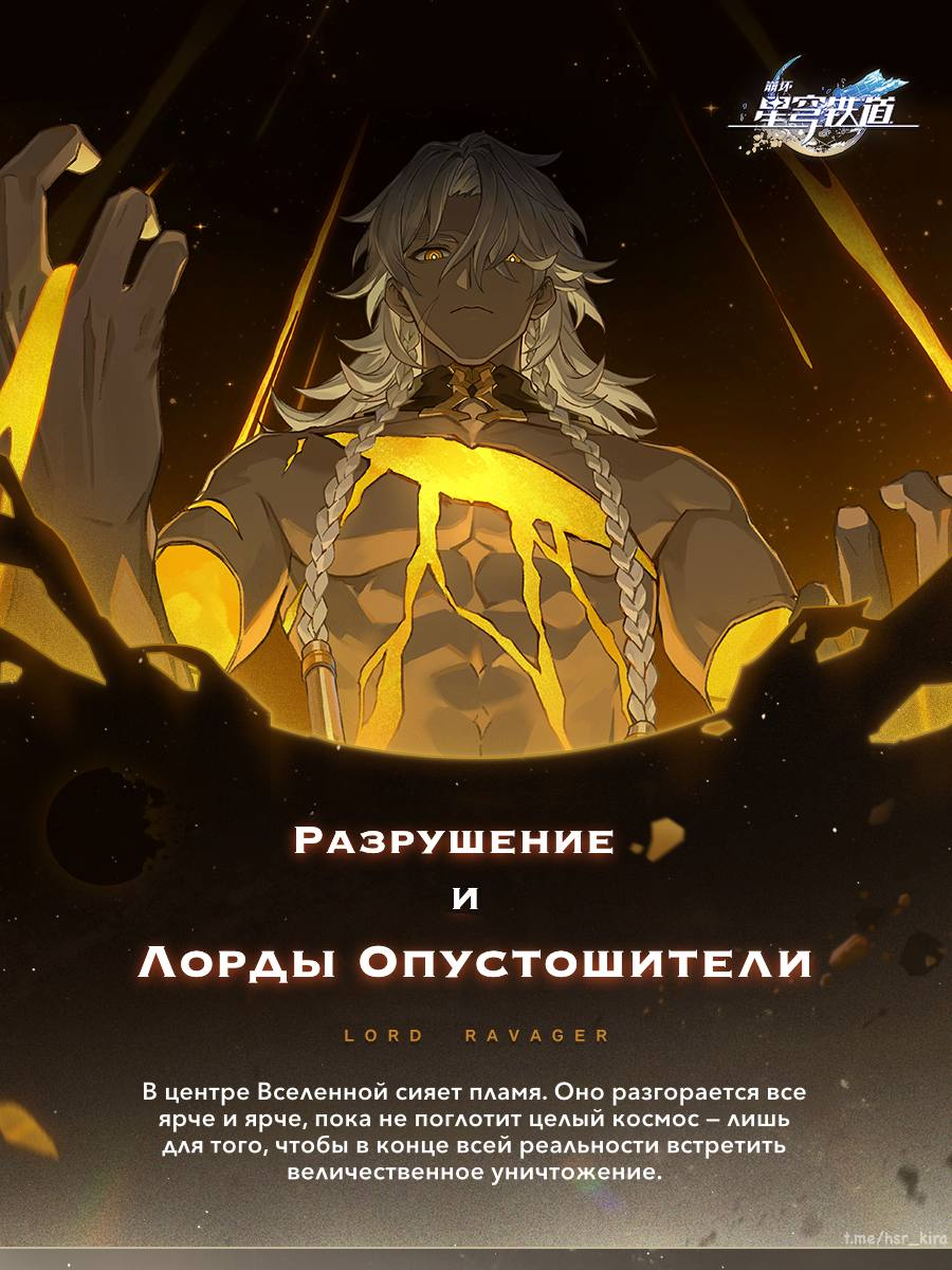 「毁灭」与(Разрушение и...) 绝灭大君(Лорды-Опустошители) 在宇宙的中心有一团火种。(В центре вселенной есть один источник пламени)。 它愈烧愈旺,直到燃尽了整片星河——(Оно разгоралось всё сильнее, пока не сожгло всю звёздную реку) 只为在一切现实的终点迎来壮美的埃灭。(Лишь для того, чтобы в конечной точке всей реальности встретить величественное угасание в прахе)。