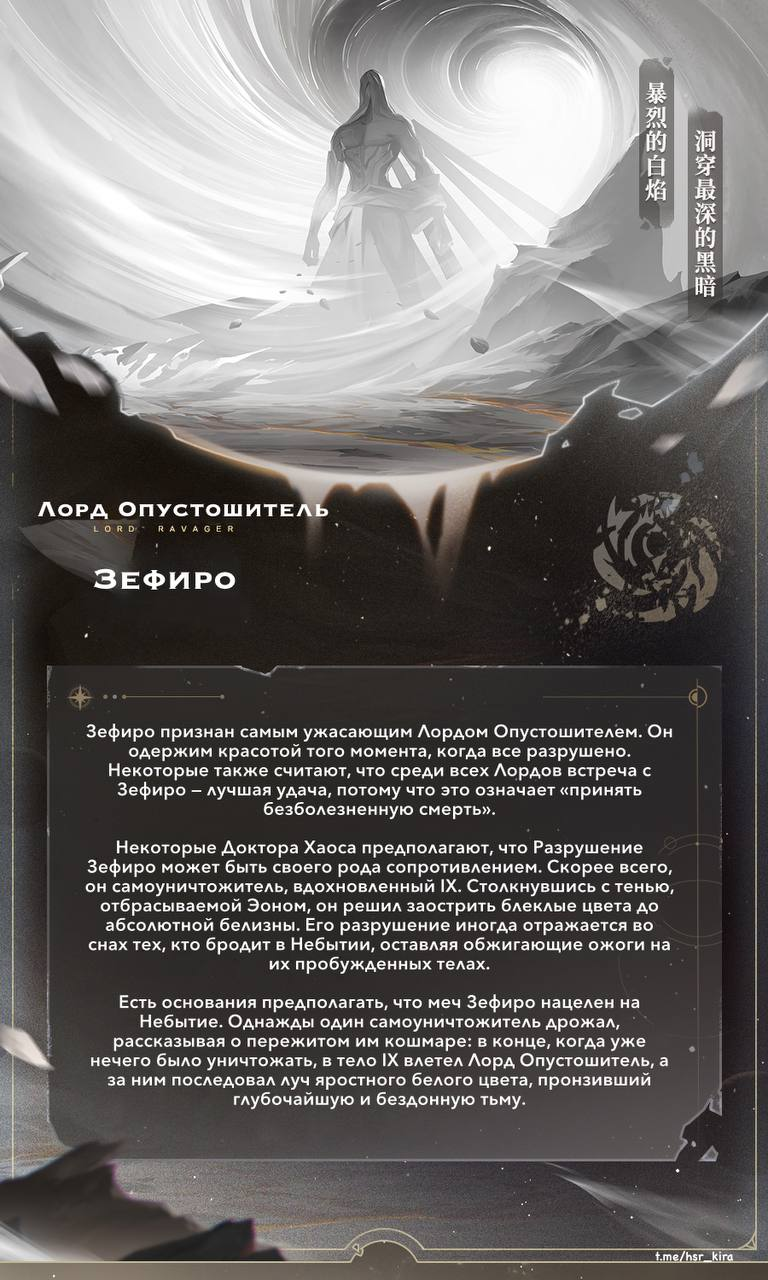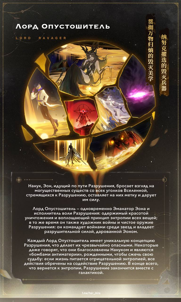 每位绝灭大君都抱持着独特的「毁灭」理念(Каждый Лорд-Опустошитель исповедует уникальную философию Разрушения),这使得他们极端危险(это делает их предельно опасными)。更有观点称(Более того, существуют теории, утверждающие),他们身受纳努克的赐福(что носящие на себе благословение Нанука),是为焚灭命途而生的「反物质弹」:倘若生命以负熵为食(они - сотворённая для испепеления Путей "антиматериальная бомба": если жизнь питается негэнтропией),一切行为都注定促成「毁灭」(то каждое действие неизбежно приближает Разрушение)。而在万物归熵的终点(И в конечной точке, где всё сущее возвращается к энтропии),「毁灭」将与银河一同终结(Разрушение найдёт свой конец вместе со Вселенной)。