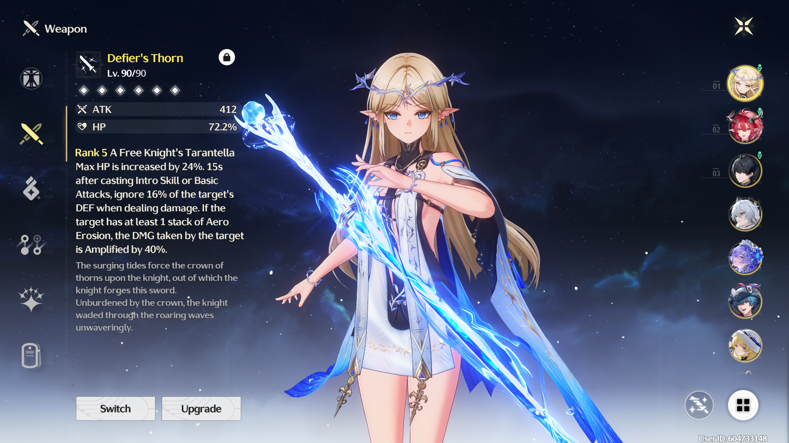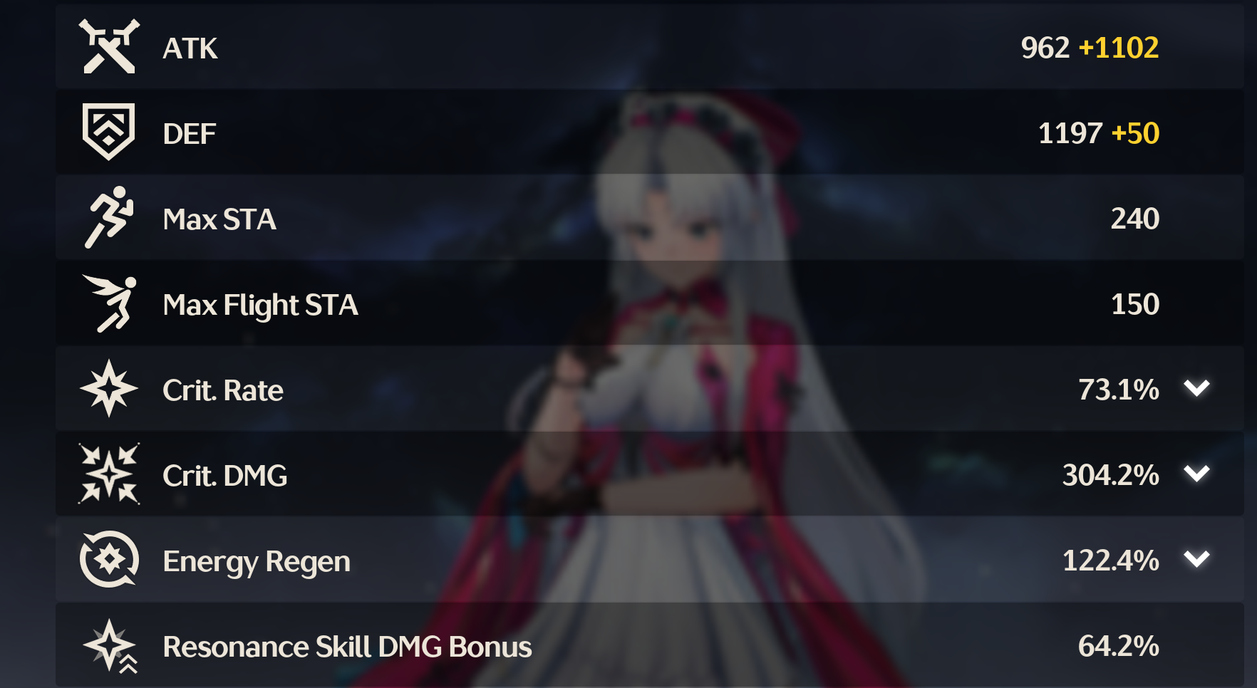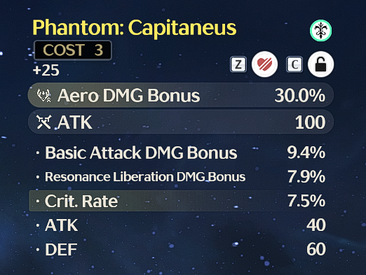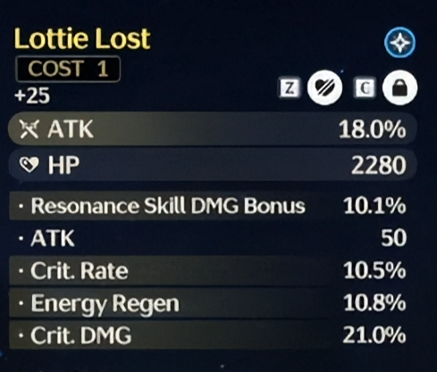 Base ATK 587 | Crit Rate 24.3% Passive - Increase ATK by 12%. Within 12sec of dealing Echo DMG, Resonance Skill DMG by 32%, Echo DMG is Amplified by 32%, and DMG dealt will ignore 8% of the target’s DEF (STC)