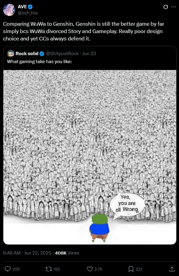 Щас смотрю на геншин и просто поражаюсь, как можно играть в это унылое кокблочное говно, когда буквально под боком есть вува, которая во всем лучше геншина