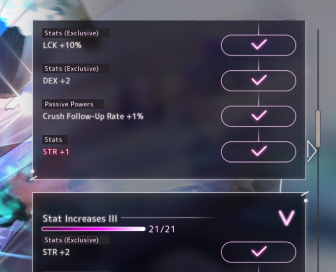 Dream tears: Item acquired from clearing flashbacks. In place of the current random buffs, Dream Tears will replace them. Using 100 each and up to 500 can you gain more max DP and raw Stats.