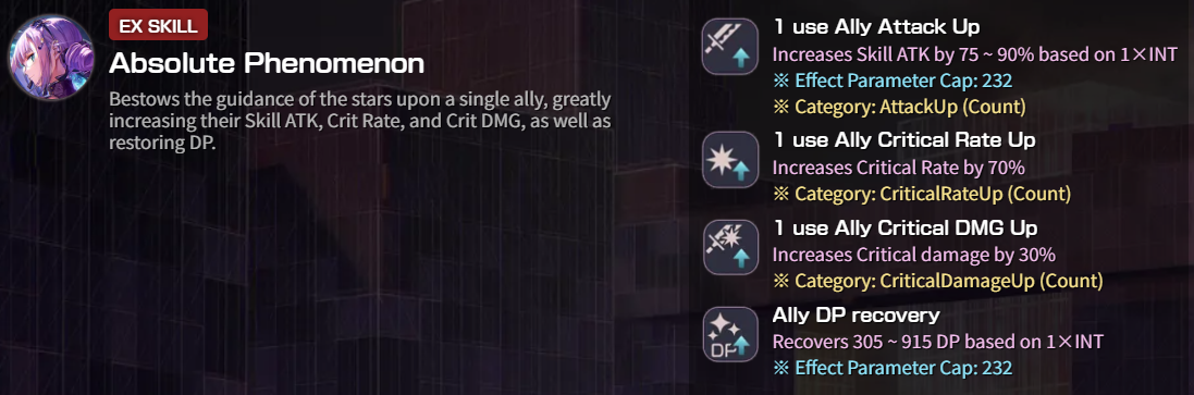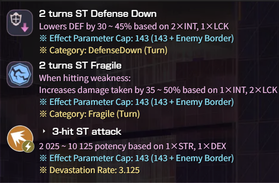 что подразумевается под 'эффект параметр кап'? надо просто иметь 232 инты для максимального эффекта? туда же - что такое 'энеми бордер' и как его математически трахать? надо просто иметь 489 инты+2удачи для максимального дебафа по пик3? если я все правильно полагаю, то требуемые цифири довольно небольшие и можно об этом всем не запариваться и всегда считать, что у тебя максимальные бафы-дебафы?