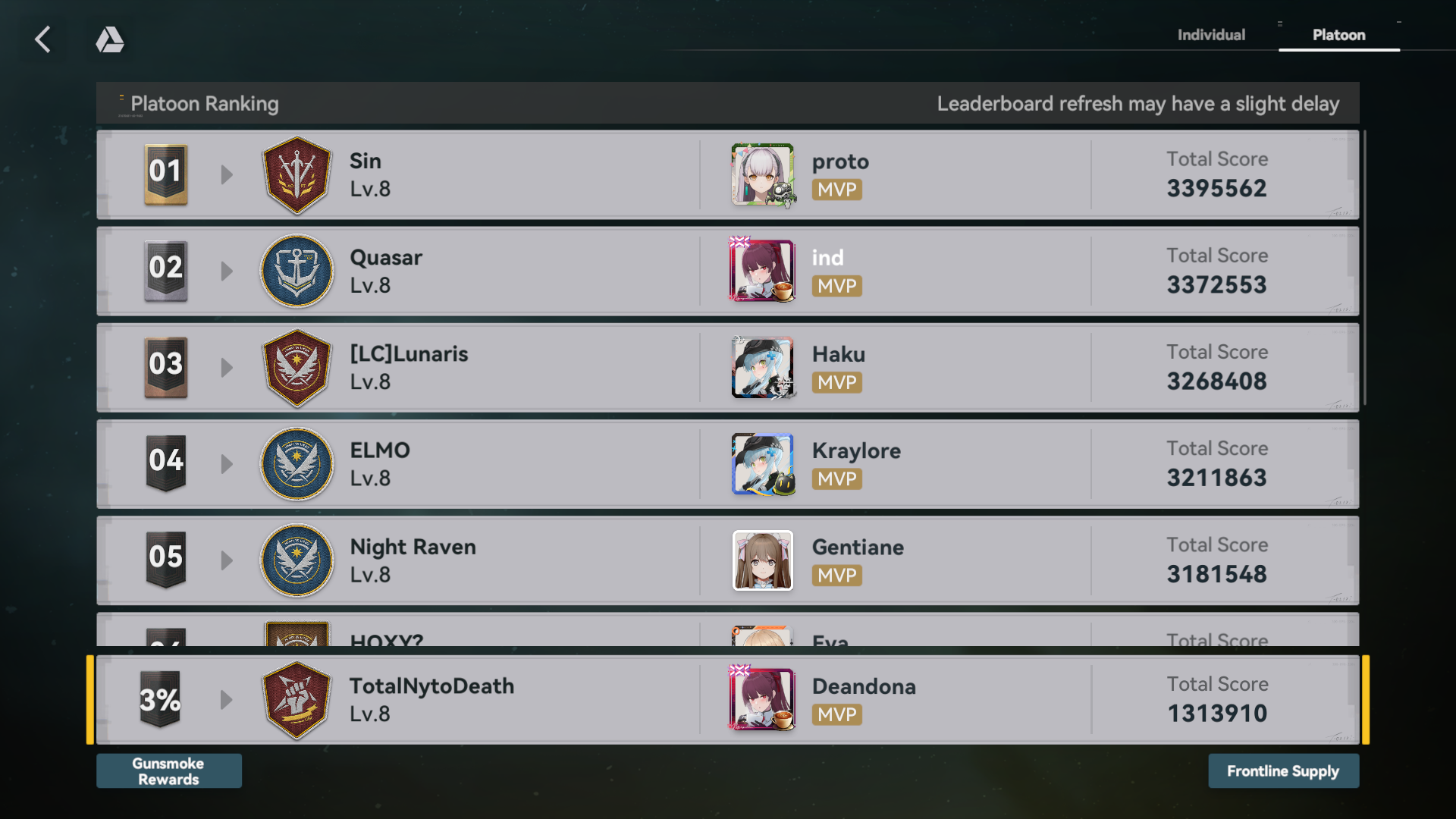 >>5055521 Я на прошлом гансмоке всё ещё играл и делал по 3 билета, в итоге сидел на топ 1 в своём платуне и мы всё равно болтались в 4-5% Сейчас забил хуй и делаю 2 авто а день, мы в топ 3-4% Южмых заебал многих людей уже, здесь литературно нехуй делать
