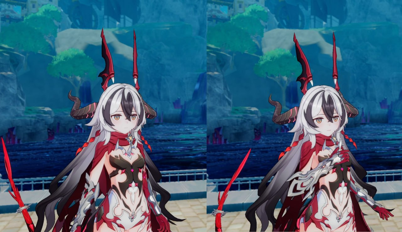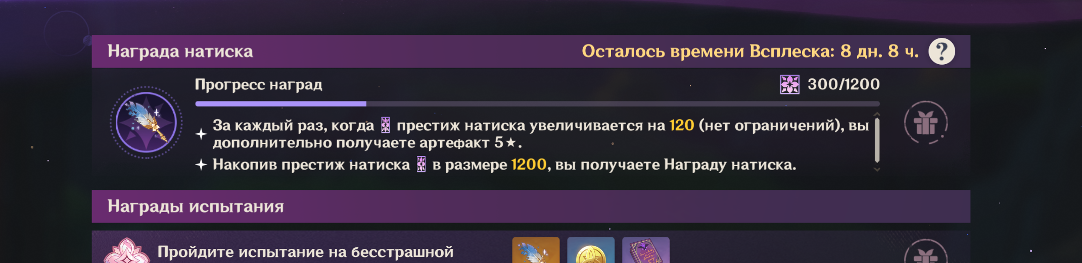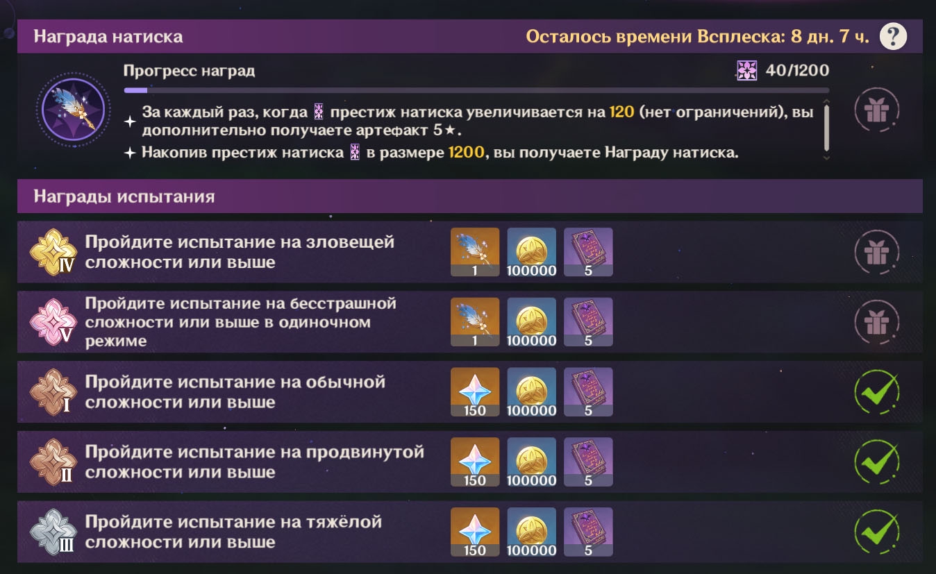 5 этаж Мрачного Натиска - Возможность облизываться на разноцветные скины с 5 моделями оружий, вертеть своими грязными ручками нельзя, это вам не Скайрим 2011 года с его загрузочными экранами, нужно ждать как они сами медленно вращаются и смотреть. 6 этаж Мрачного Натиска - взять напрокат скины оружия, но подсветка будет отключена за неуплату электричества. 6+ этаж Мрачного Натиска - арендовать скины оружия с полным сервисом высшего качества, аренда будет стоить независимо от вашего региона 140,000 рублей в патч (цена с6 лимитки), но если не платить аренду, покупая свежих элитных персонажей лучшей богатой гачи Геншин Импакт, то скин оружий изымут с последующим увольнением из френдлиста и гильдии форчана.