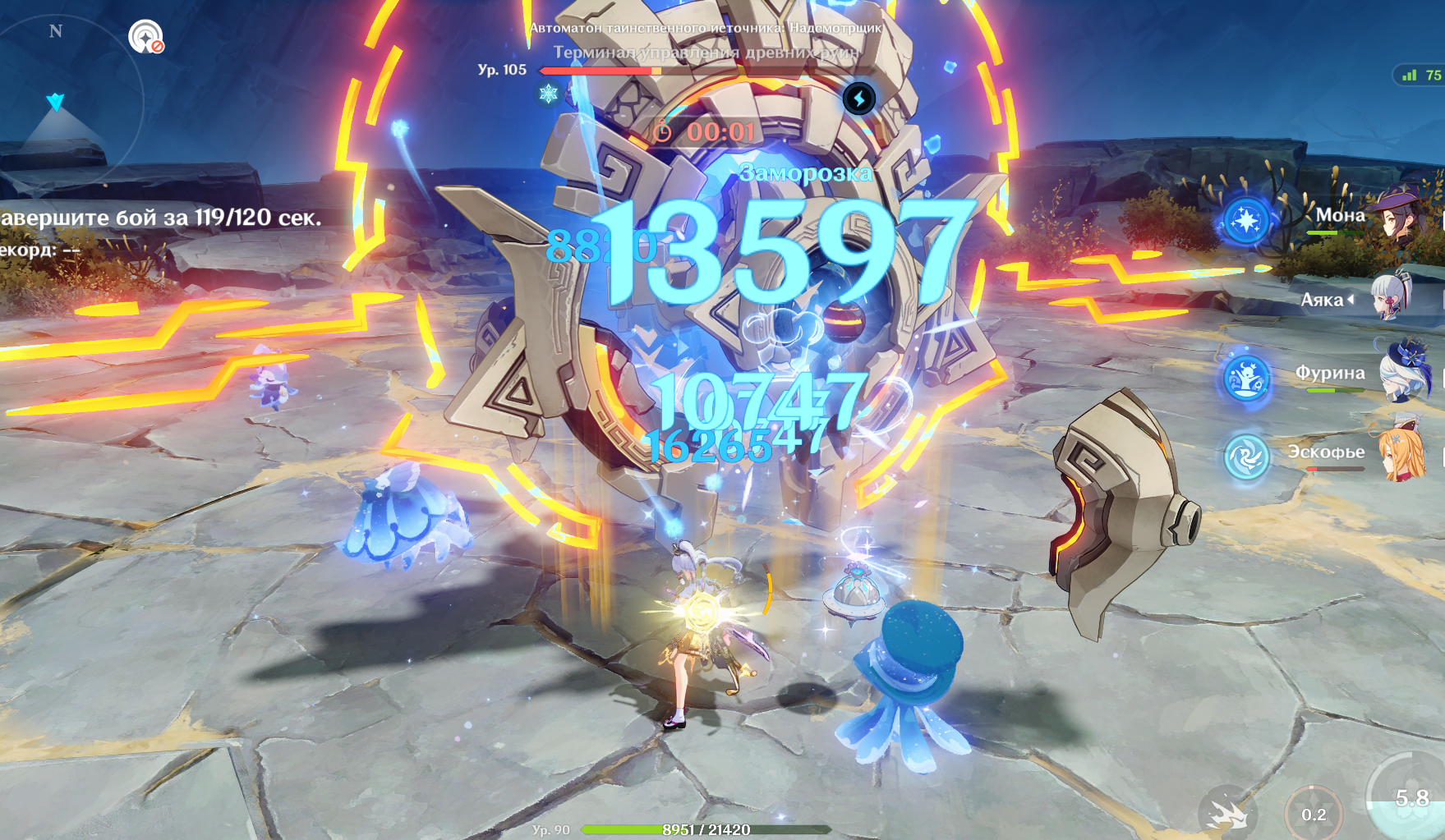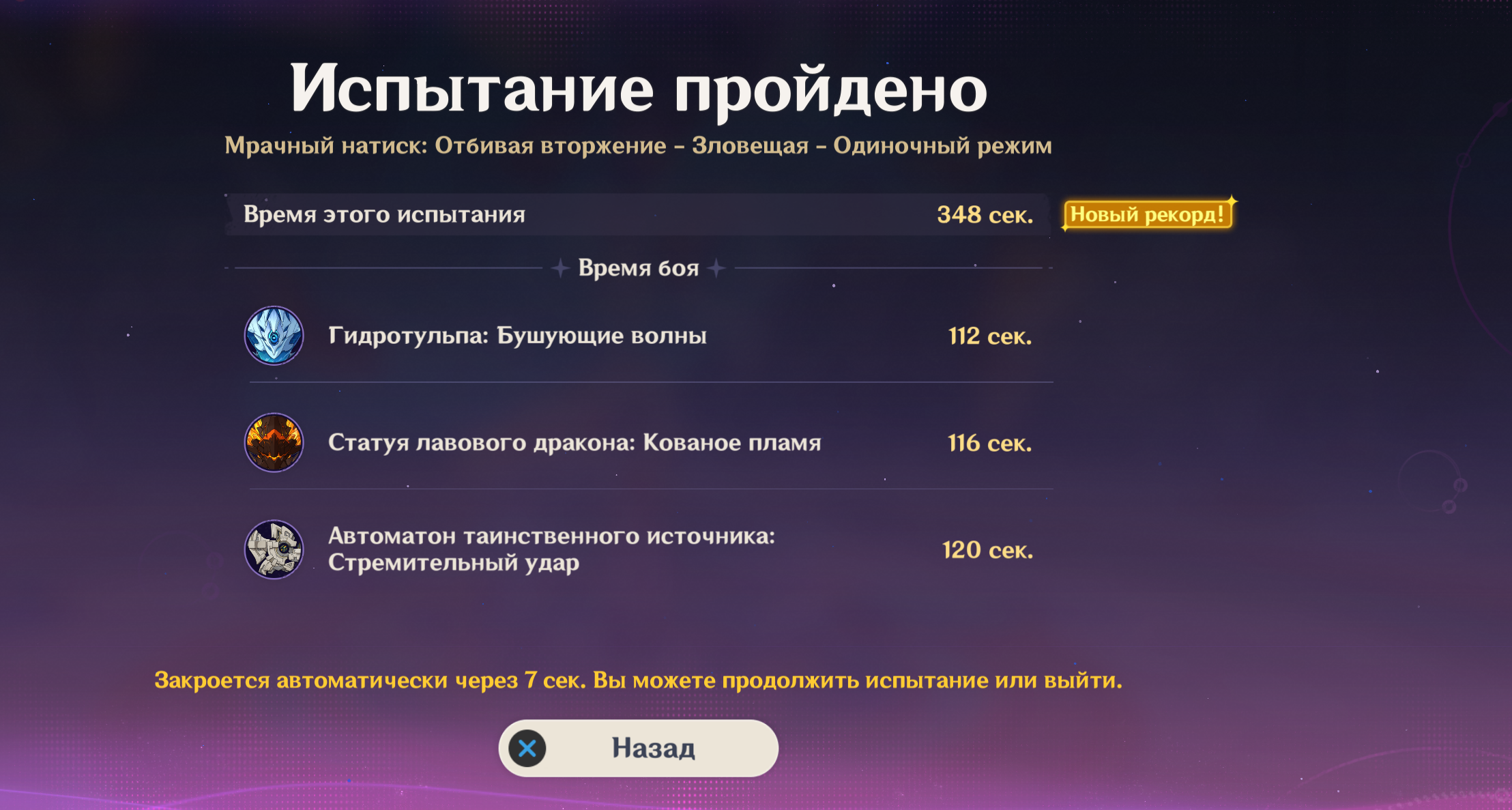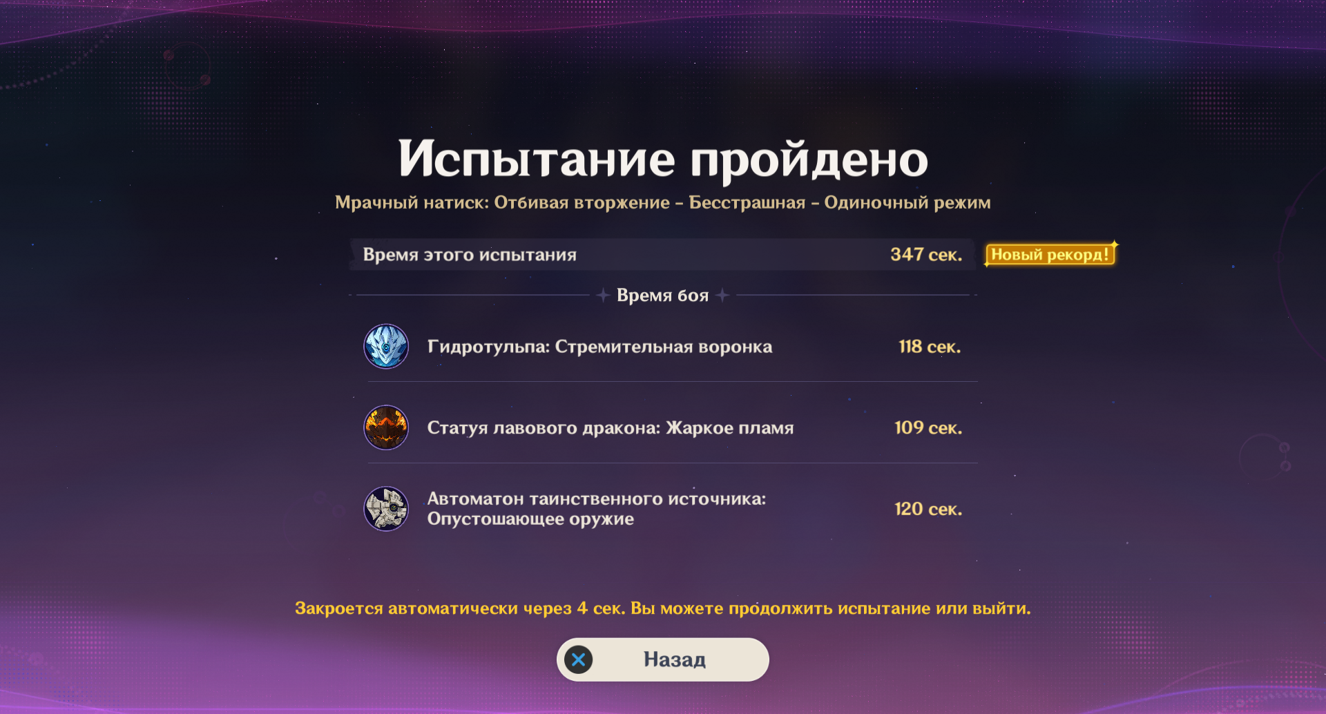 Фух, ебать. Там натурально на таймере 00:00 было и этот уебок наконец умирает. Я думал засчитают поражение, но нет. Всё, нахуй. На сегодня геншина мне хватит