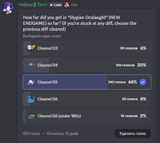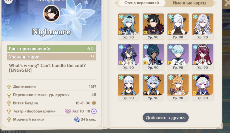 ну вот например два чела с явным потенциалом под 6 этаж забрали награды с 5 и оформили альт + ф4. и еще один закрыл 3 этаж и скрыл результаты, хотя там в профиле все ебало в с6 персах. ну и еще несколько китов вообще в игру не играют, у них даже бездна с агушариумом никогда не закрыты и в ивентах с табличками они не участвуют, зато чемпики с6.