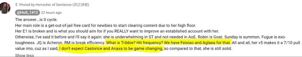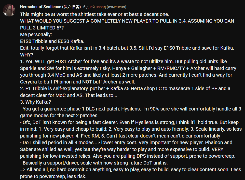 >>5115789 Это не единственный его обсер кстати. Он форсил Искорку под Мудея, мол, она его бис саппорт и называл Анаксу сильнейшим дд 3.0, брокен йоба нереальной имбой. Щас советует новичкам крутить E1 Трибби (которую называл средней и ненужной в аое, лол) и Кафку. Мол 90% уверен, что с Гилисенсой поиграет 2 патча. Хотя кита Гилисенсы у него нет 100%. Бля ещё и это "This might be at worst the shittiest take ever or at best a decent one." прям охуенно звучит, оче полезно. Спекся голубчик совсем.