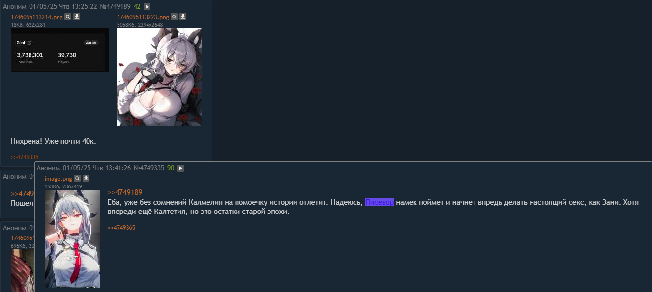 >>5118771 >этот потужный форс Что за бред. Занифаг начал гнать на Картоху. Ессесно мне лично это не понравилось. Я раньше зани обходил стороной ибо не мой типаж, хоть и персонаж интересный, но теперь лично к зани неприязнь. Сразу понимаю, что человек который мейник зани - плохиш.