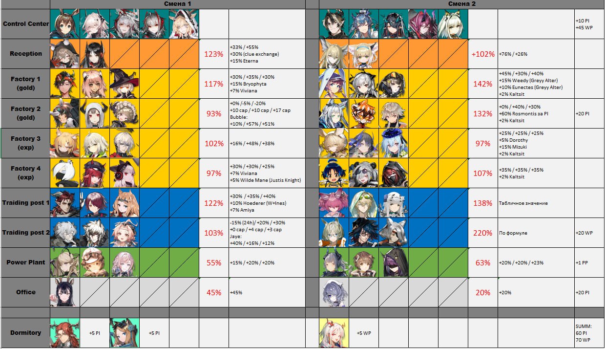 Пик 1 - мой текущий сетап. В трейд постах сейчас батрачит Ходор с латеранцами (блин, почему ему не сделали бафф с юшкой, такой бы мем был). И кстати, Вишадель в игру ввели, но перк Ходора под нее не поменяли, и она его не бафает (в отличии от Лемуен). Грифы - жопошники. Короче, под него отдельный слот в контрол руме для Вишни нужно держать, чтобы он 40% давал, очень неудобно. Думаю прокачать Морган, Дельфину и Андерфлоу, на замену, а сарказа с обеими тараканами отправить на пенсию. Минус 5% для клюшек, которые дает Шишня, как-нибудь переживу. Как и тиму Джея: с выходом Лемуен она побольше него циферки выдавать будет.