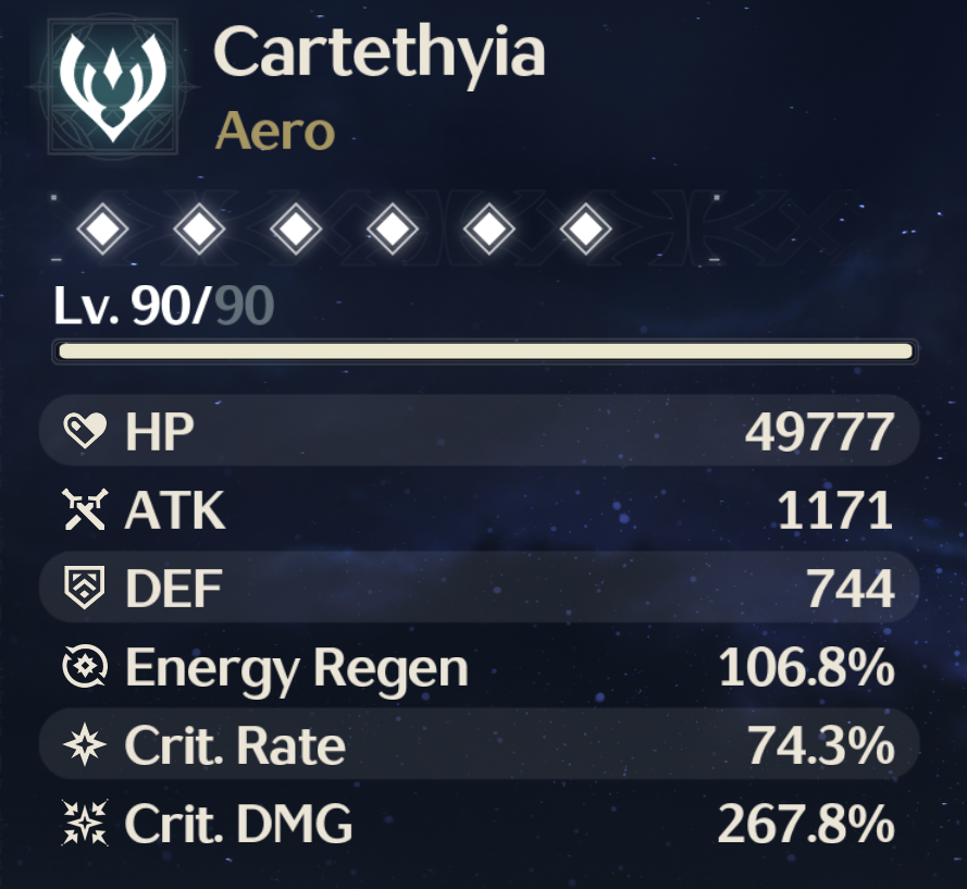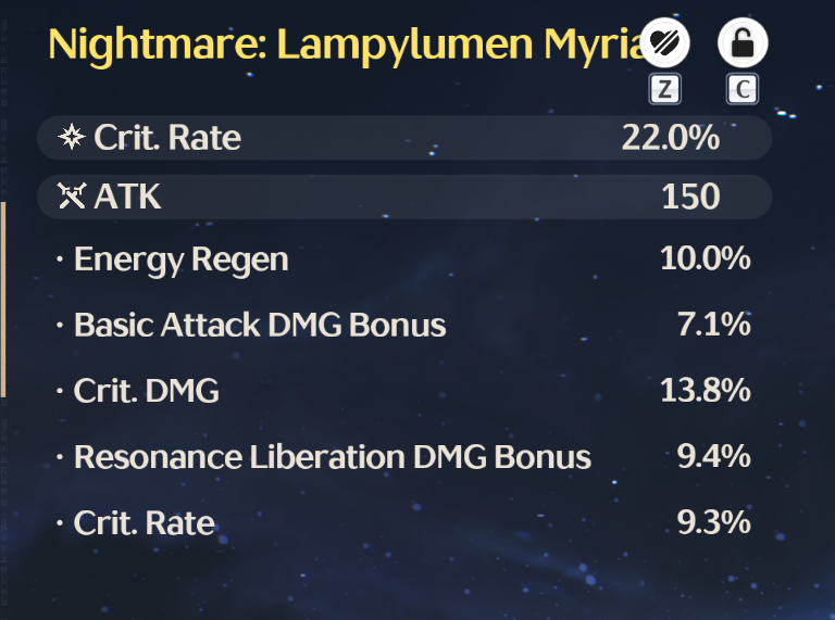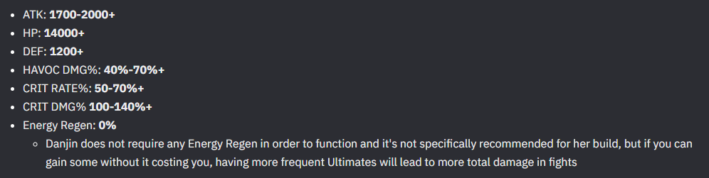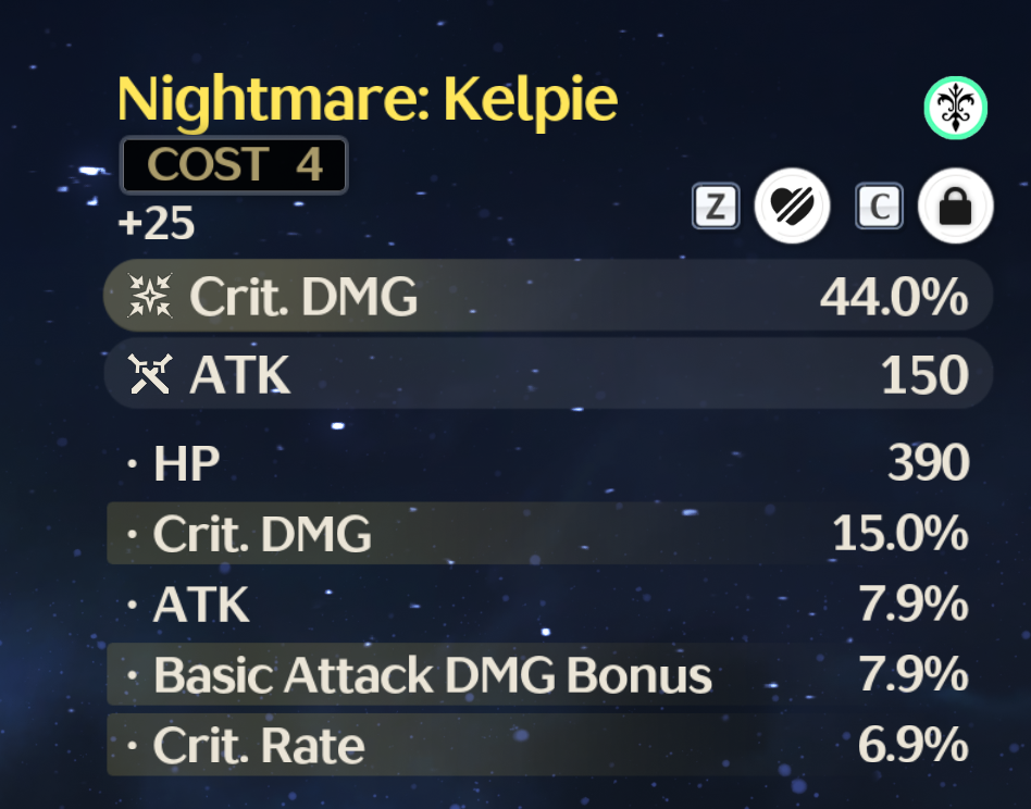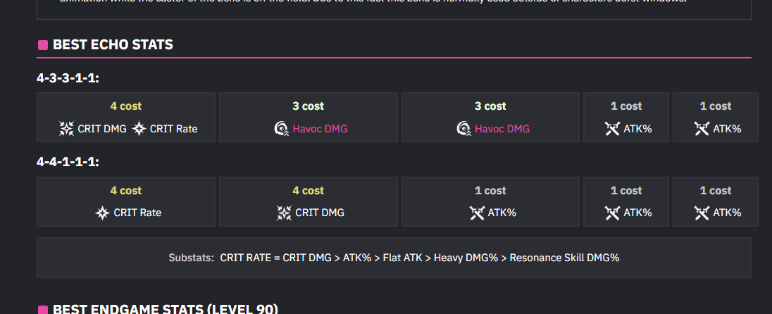 >по статам рекомендованным смотреть? Дабл-криты во всех статах, остальное - атк%, флет-атк, скиллДМГ, хевики - по желанию. В руки либо Стандартный меч - а это значит что 4кос эхо на КУ надо, либо Сигну чанки - тогда 4кос на КШ. 3кос - либо ЕЛМ%+ЕЛМ% либо ЕЛМ%+АТК%