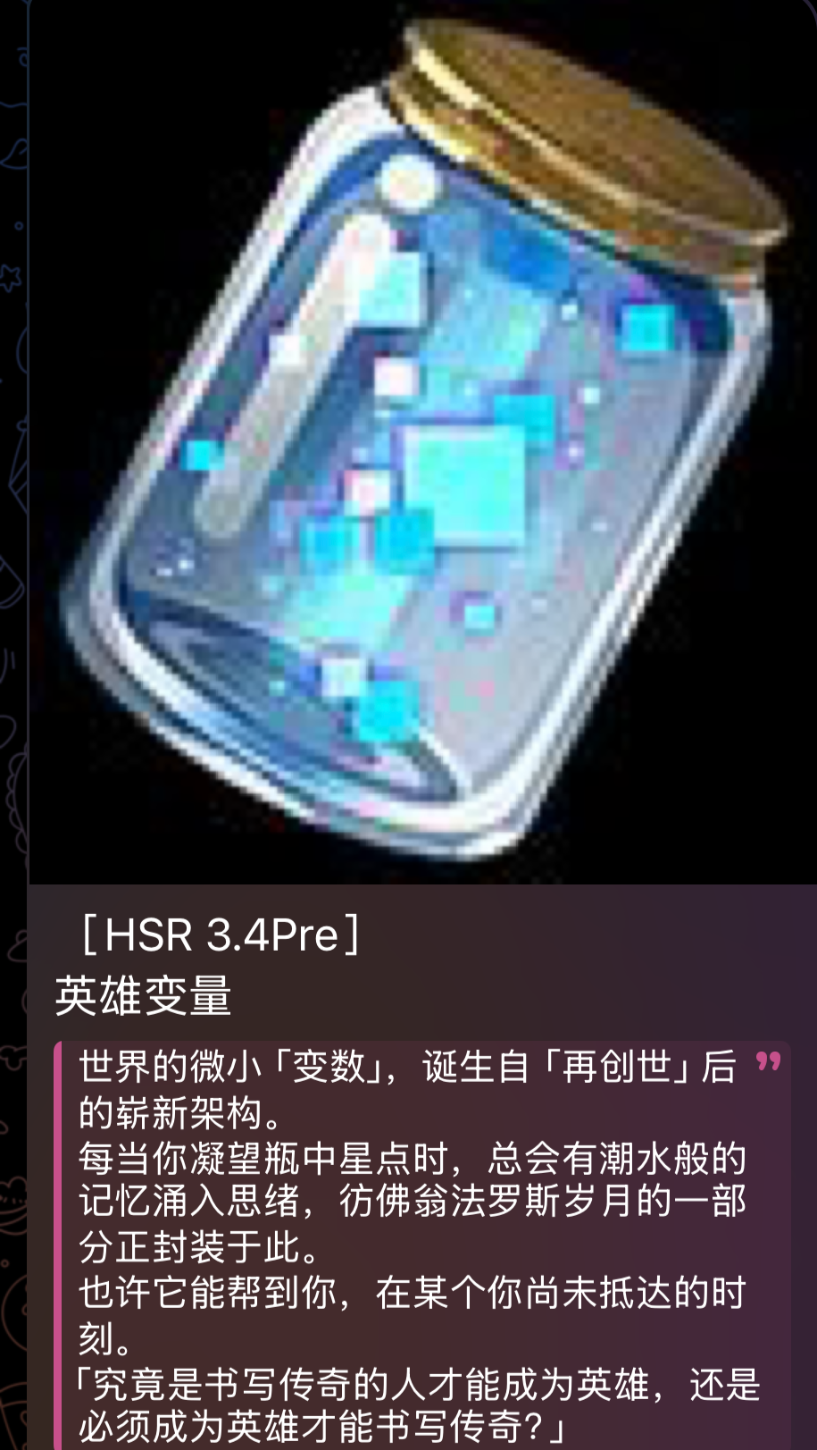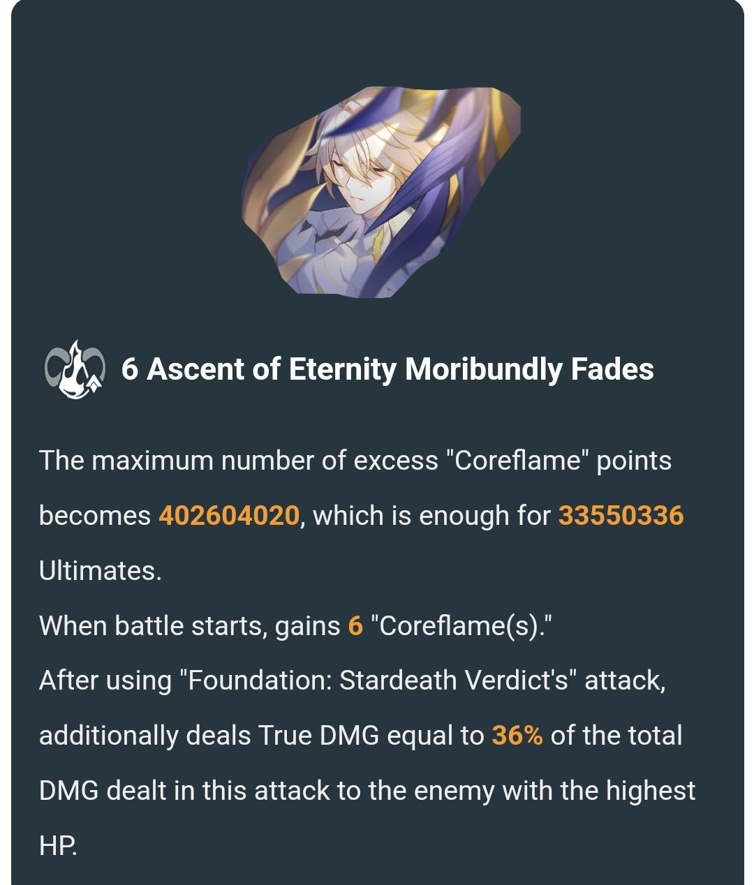 "The Phainon of the previous life will entrust the memories of 990 million reincarnations and the fire it carries to the Phainon's of the next life, and travel to the next reincarnation to fulfill the agreement with Cyrene, stop the journey of chasing fire, stop the birth of the Iron Tomb, and hand over the memories and fire to the Phainon's who returns this time. At the same time, the Phainon's who returns this time will inevitably use this body, the god, to burn himself to death.