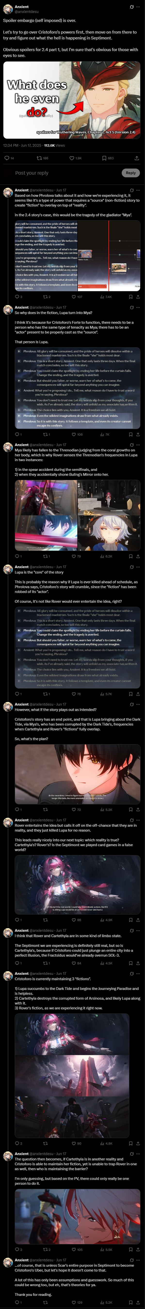 >Мне никогда не было понятно, почему люди критикуют сюжет 1.0, но хвалят 2.0. Да, в 1.0 были проблемы, такие как неровный темп и чрезмерная экспозиция в лице ЯнЯн, но все равно он казался настоящим сюжетом. В нем были ставки, развитие и правильная кульминация в виде битвы с боссом-Тренодианом. Затем вышла 2.0, и смена тональности была резкой. Сюжет кажется бесцельным, просто блужданием по миру, встречами с будущими игровыми персонажами, которые без всякой причины флиртуют с главным героем, а потом пропадают. Нет четкого сюжета или цели, каждый раз, когда я чувствую, что что-то назревает... ничего не происходит. Практически нет никакого значимого взаимодействия между персонажами, которое не вращалось бы вокруг Ровера. Все превратилось в цикл «вайфу месяца». Я не прикасался к новому квесту, потому что, честно говоря, он меня не вдохновляет. Это похоже на рутинную работу, и я играю только для того, чтобы собрать награды.
