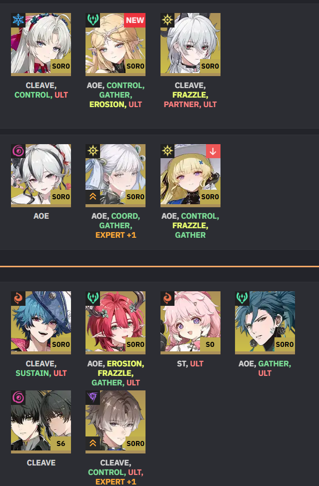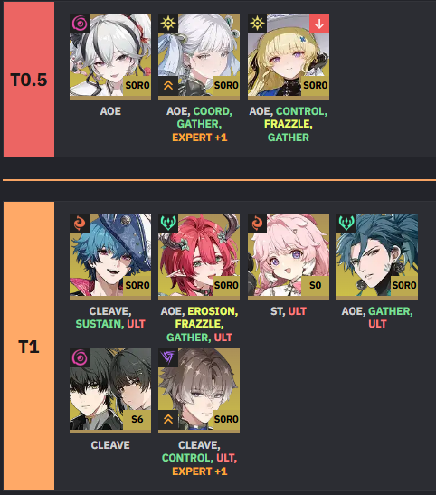 >Джинси T0.5 >Сянли Яо T1 Я бы этих двух поменял местами. По ощущениям, они оба у меня наносят +- одинаковый урон, при этом у Яо стандарт перчи, а у "сильнейшей" сигна. Яо в разы более гибкий в пачкостроении, более удобный в игре. Умеет в квиксвап. Я его до Зани в кораблики брал с Феней. Ставить его в один тир с бездамажной анкор, хавок ровером и чекушкой - кретинизм полнейший.