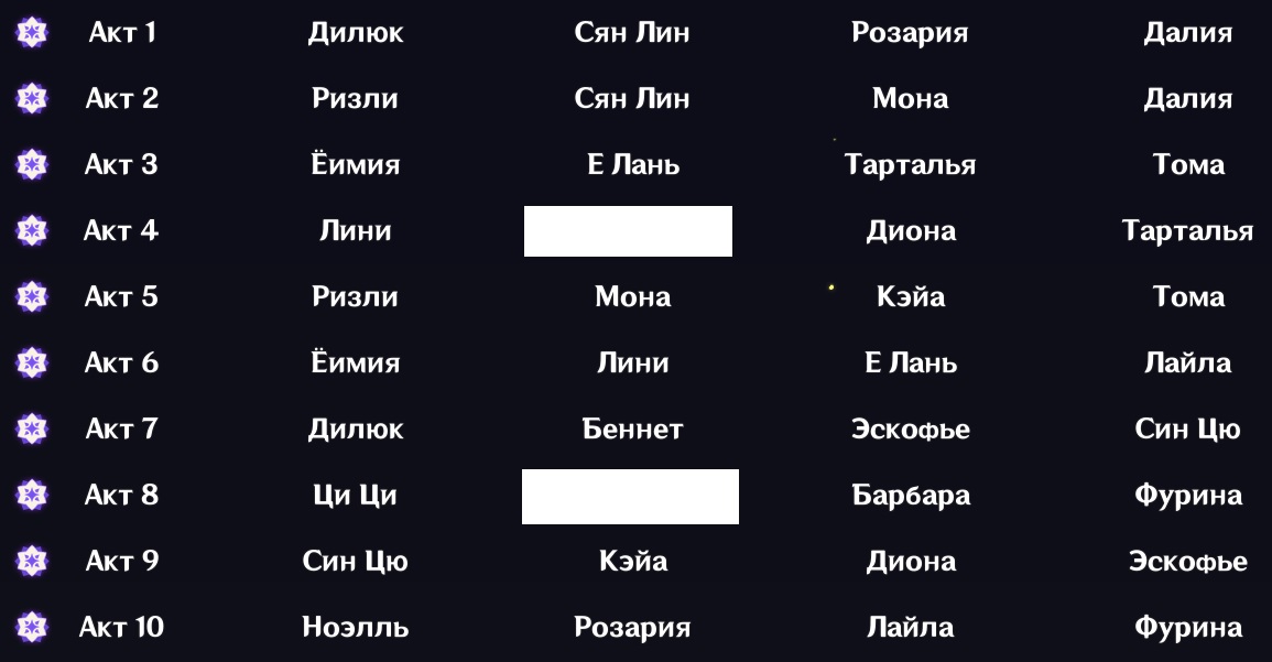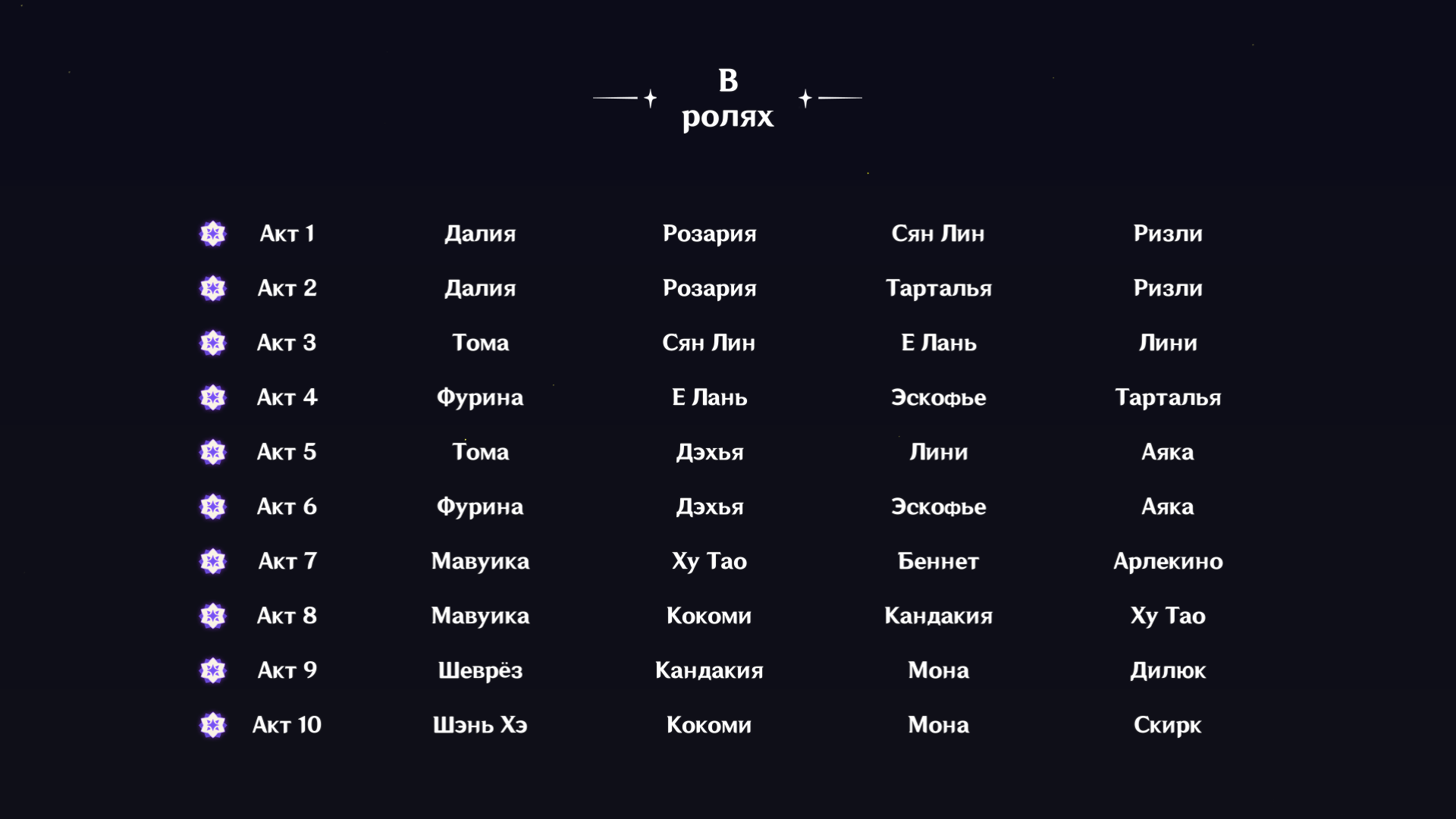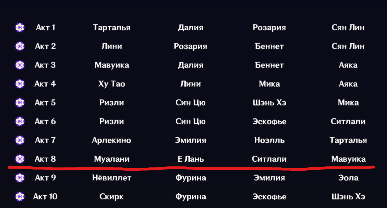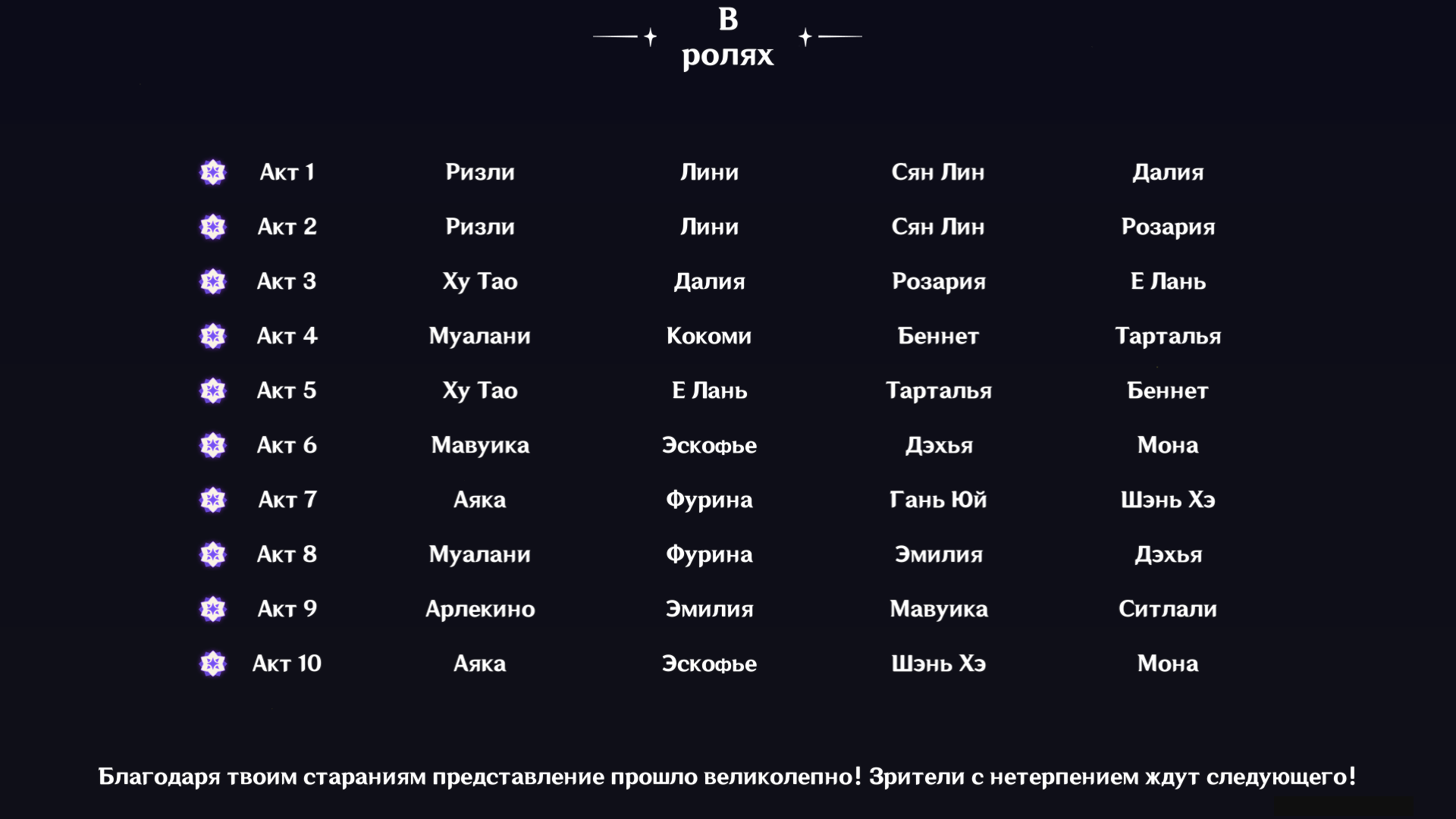 На самом деле, ещё вчера понял, что дело пахнет керосином и давка как раз таки будет в начале, на финал-то предсказуемые Фурины с Скирками, а вот в начале. Например, скрипя зубами пришлось брать Фурину на танцоров, потому что буквально за файт до них закончились Сянка с Беннетом, а больше пиро и нет, Лини - это много смех, но мало пиро и дамага тоже мало, так что нафиг его. Вникать в эти пневмы ну это прям капец, слишком душно и единственное, что помню, так это что Фурина сносит щит с обычной атаки и все, такое. Ещё немного сгорел с Пиджака, взял в 7 акт на роботов и это так себе, К Батьку особых претензий нет, просто как все пиро сильно требует Беннета и много гидро или крио, Бабулю там или Елань, а в тиме были Мона, мисс Лань и Лайла, не самая плохая бригада, но весь прокаст висит буквально пару сек, жесть.
