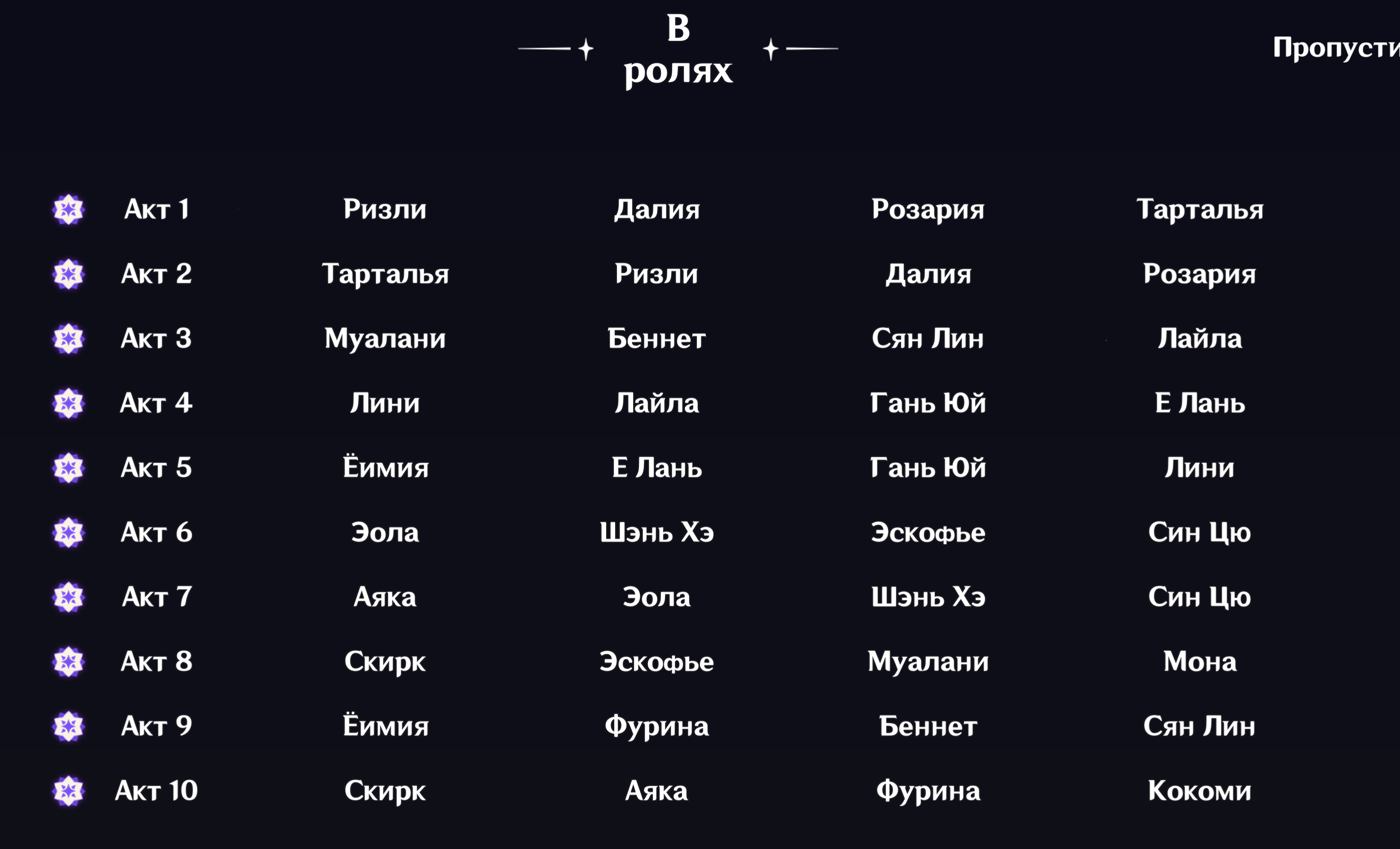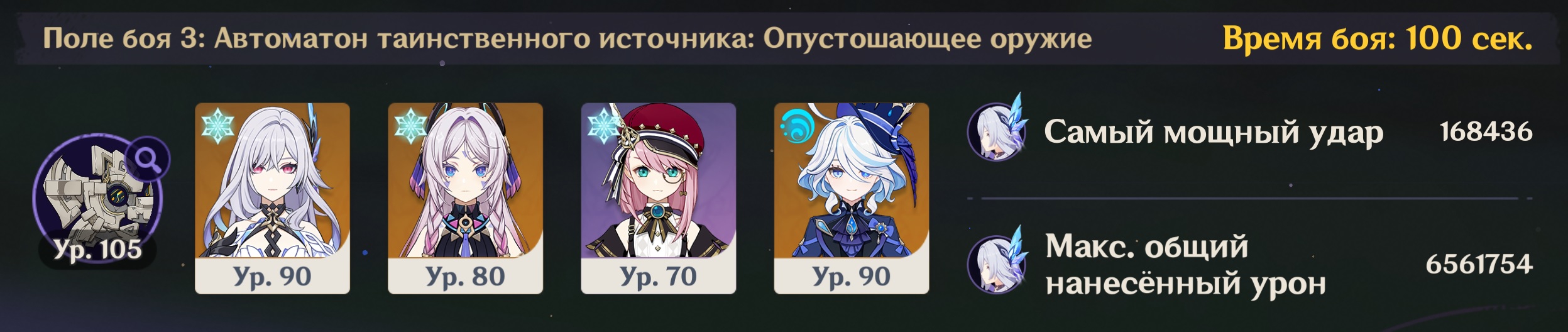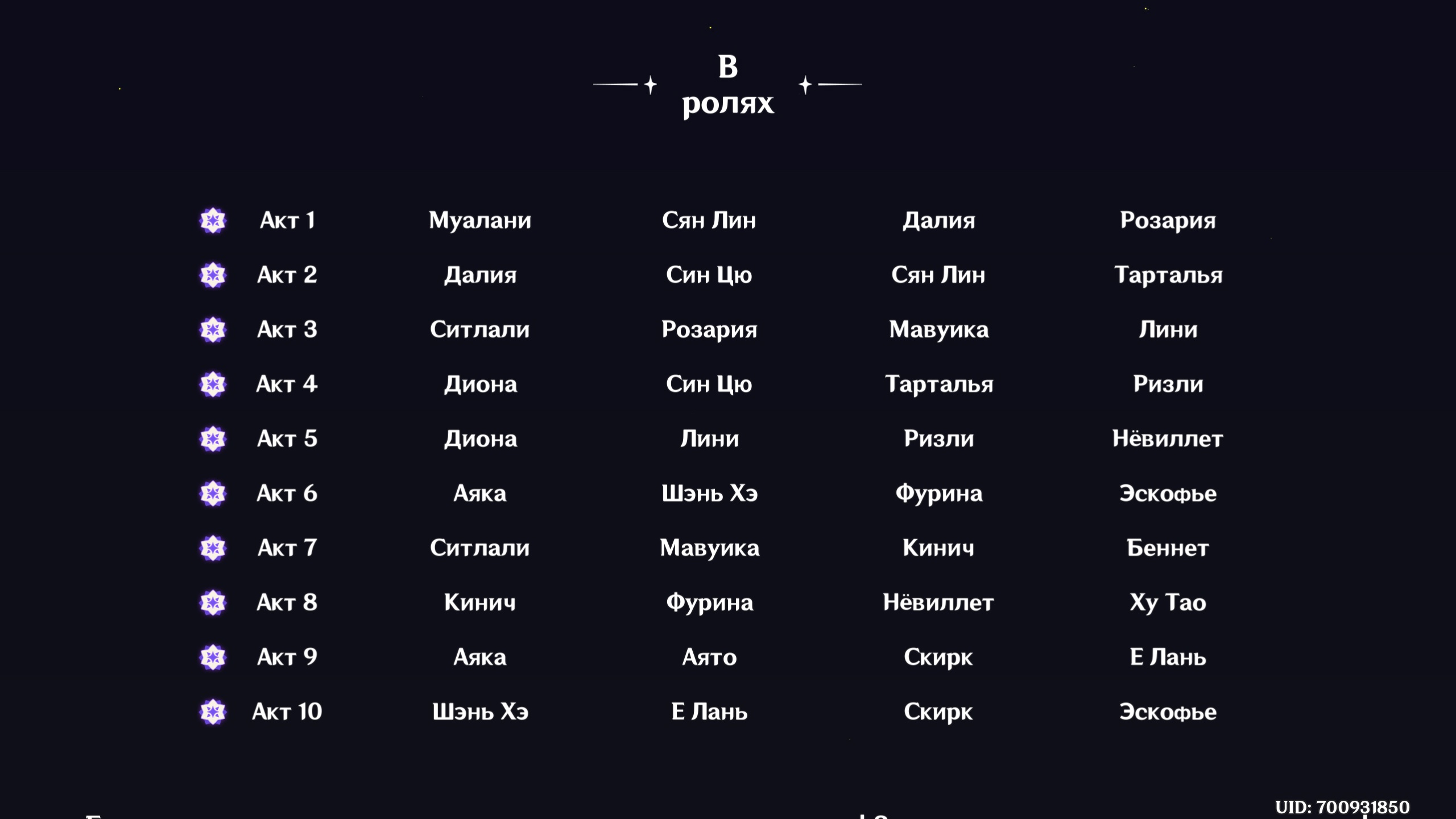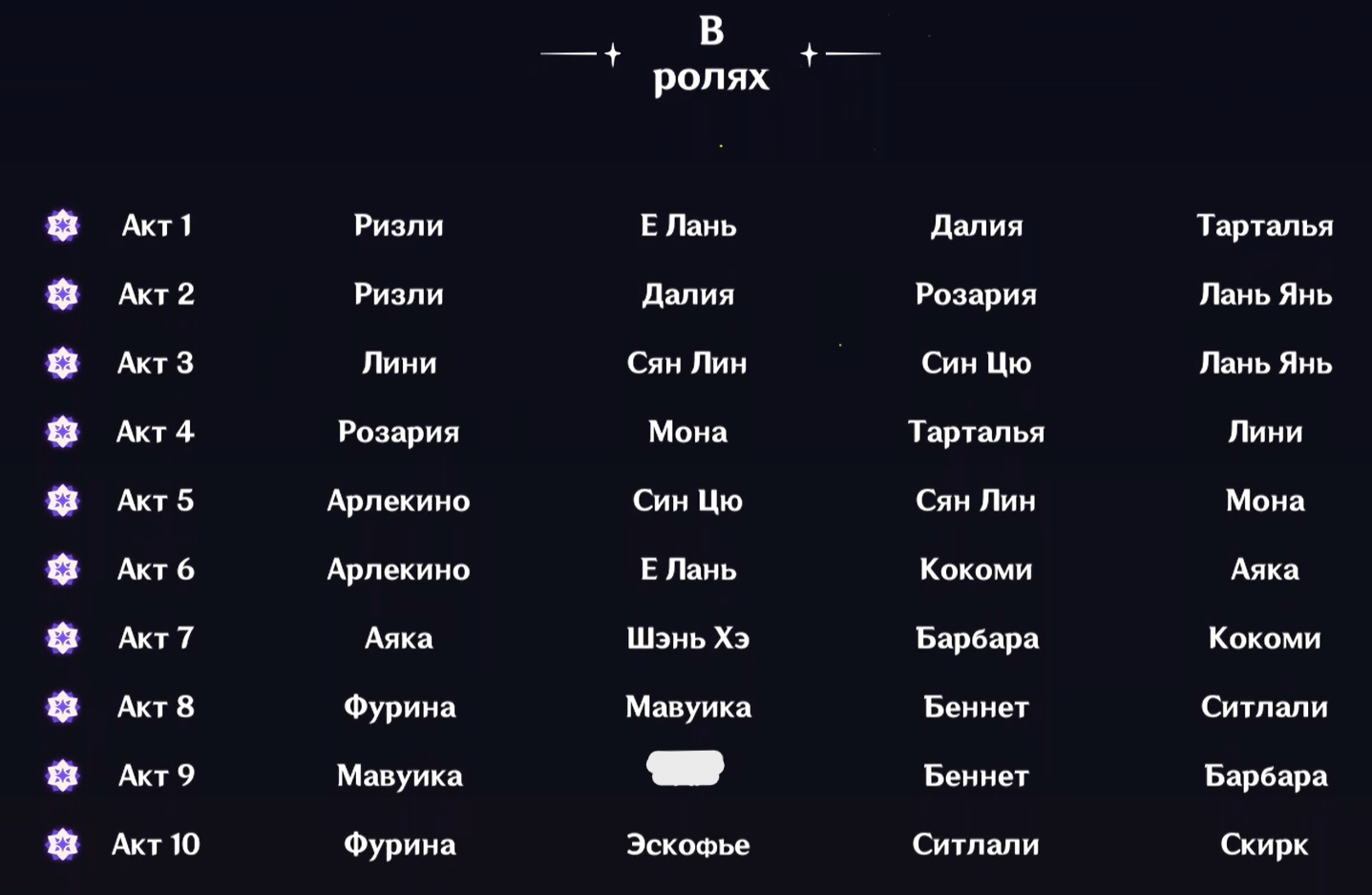 На самом деле, ещё вчера понял, что дело пахнет керосином и давка как раз таки будет в начале, на финал-то предсказуемые Фурины с Скирками, а вот в начале. Например, скрипя зубами пришлось брать Фурину на танцоров, потому что буквально за файт до них закончились Сянка с Беннетом, а больше пиро и нет, Лини - это много смех, но мало пиро и дамага тоже мало, так что нафиг его. Вникать в эти пневмы ну это прям капец, слишком душно и единственное, что помню, так это что Фурина сносит щит с обычной атаки и все, такое. Ещё немного сгорел с Пиджака, взял в 7 акт на роботов и это так себе, К Батьку особых претензий нет, просто как все пиро сильно требует Беннета и много гидро или крио, Бабулю там или Елань, а в тиме были Мона, мисс Лань и Лайла, не самая плохая бригада, но весь прокаст висит буквально пару сек, жесть.