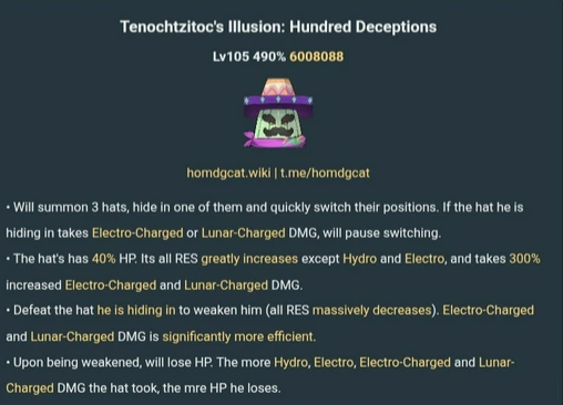 Босс Cactus Вероятно, самый "проплаченный" (shilling) босс из трех. Ineffa показывает себя намного лучше команд без нее. В определенный момент босс бросает 2 шляпы на землю, а сам превращается в шляпу и получает очень толстый щит. Затем он совершает 5 перестановок (swaps) всего. После этого он сможет накапливать заряд. На настоящей шляпе есть усы, поэтому ее можно заметить, если она повернется к вам. Заряд можно заполнять много раз в течение этой фазы. На этой фазе весь урон Гидро, Электро, а также урон от Lunar Charge (LC) и Электро-заряда (Electro Charge, EC) способствует заполнению заряда. Один полный заряд уменьшает щит на 15-20%. Чем выше скорость применения элементов (app), тем лучше. Больше Электро-заряда (EC) / Lunar Charge (LC) = хорошо. Самый простой способ заметить настоящую шляпу во время перестановок - частицы электро ауры вокруг настоящей шляпы. Урон от Гидро, Электро, Электро-заряда (EC) и Lunar Charge (LC) накапливается и высвобождается после разрушения щита. Похоже, что он получает полный урон от LC/EC, но меньший урон от прямого урона (direct damage). В среднем, он терял около 25-30% HP после завершения фазы щита. Шляпы находятся примерно на расстоянии одного элементального навыка Кейи (E) друг от друга (да, не лучшая единица измерения, но не знаю, как иначе объяснить), поэтому не рассчитывайте, что AoE будет эффективным. При использовании Fischl вместо Ineffa команда в среднем проходила испытание примерно на 20 секунд медленнее. Разница между Ineffa C2 и Ineffa C0 составляла дополнительные 15-20 секунд.