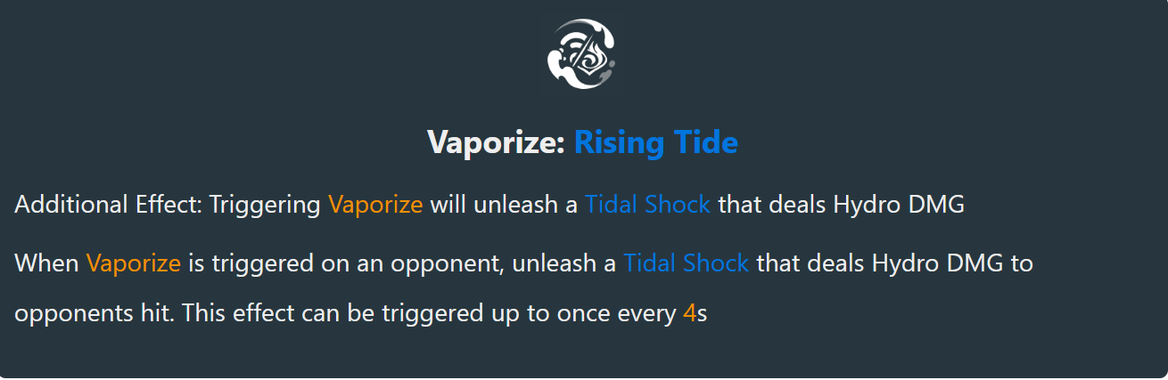 >Additional Effect: Triggering Vaporize will unleash a Titanic Tide that deals immense Hydro DMG over a large AoE >When triggering Vaporize on an opponent, the Tidal Shock unleashed is upgraded to Titanic Tide: Deals greater Hydro DMG to opponents in a larger AoE