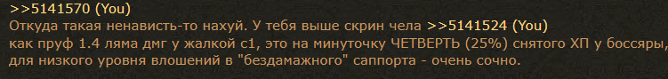 >>5141570 Откуда такая ненависть-то нахуй. У тебя выше скрин чела >>5141524 как пруф 1.4 ляма дмг у жалкой с1, это на минуточку ЧЕТВЕРТЬ (25%) снятого ХП у боссяры, что для низкого уровня влошений в "бездамажного" саппорта - очень сочно.