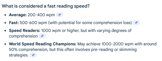>>5145453 Как ты за день прочитаешь все четыре тома Войны и мир от Толстого сохранив в в памяти всё содержимое и будучи могучим в то же время его пересказать с краткой выжимкой всех данных? А это именно что такая скорость