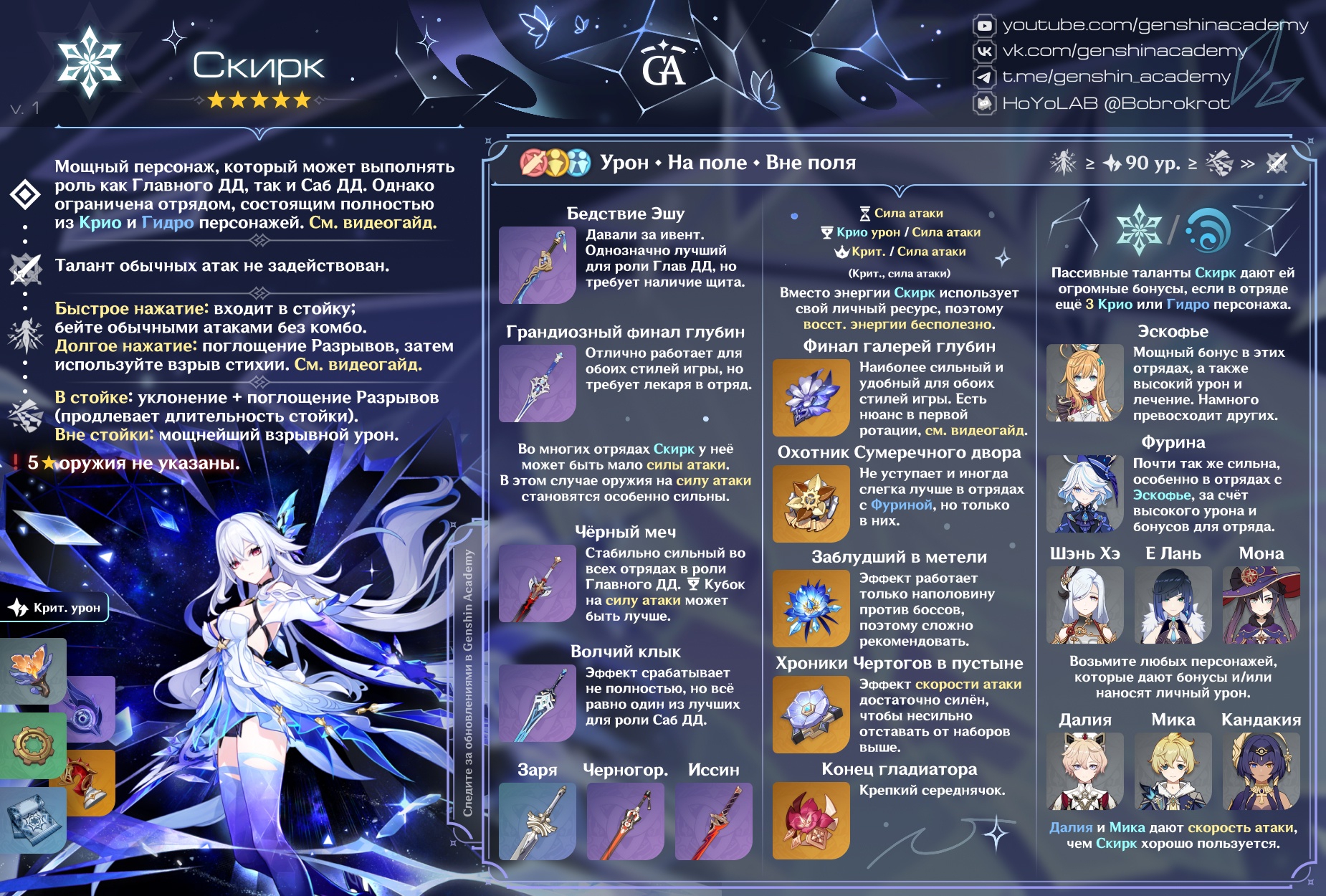 >>5181438 Ей можешь однорук дать, который по крио и гидро дополнительный урон дает. Идти в баннер с таким "богатым" запасом круток смерти подобно. Тем более для новичка. Скирк очень сильная, потом в Фонтейне ей крафтовый одноручник дашь