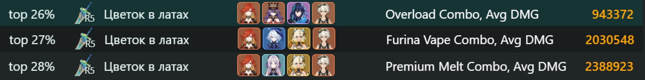 ✦ Калькуляторы урона https://genshin.aspirine.su/https://frzyc.github.io/genshin-optimizer/https://teucerdev.github.io/little-bro/https://gcsim.app/