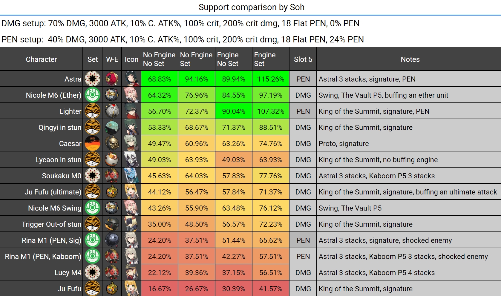 >>5192136 Дебаф Николь самый сильный, но он и самый короткий (3 секунды). Дебаф Рины - это, по сути, дебаф Николь, но чуть поменьше, но и действует дольше (5,5 секунд, 11 секунд на М1). Рина выдает максимум 28,5% пробития. Но пробитие можно собрать и на дамагере тоже, и оно будет стакаться. Прибавка силы атаки слабее, но обычно бафы силы атаки висят долго, да и действуют и на урон критов и на урон аномалии. Короче, просто стабильная прибавка к урону, практически вечная.