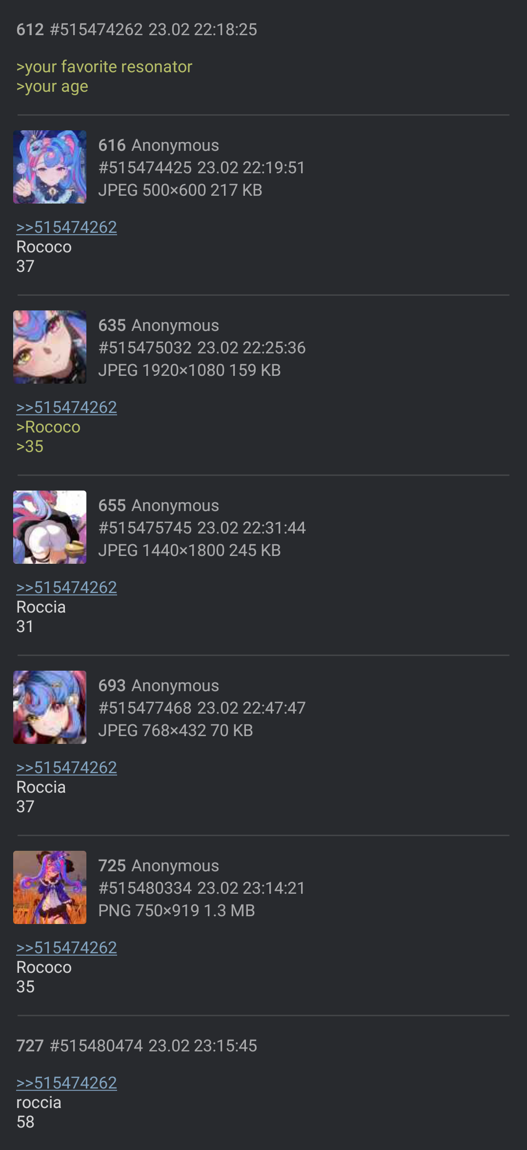Жижи, Рочча и Фиби явно персонажи из Генша. Картоха перс из Промилии Зани перс из Рельсы гендербенднутый из падисара Кантарелла перс из Азур Лейн Фролова перс из ПГР