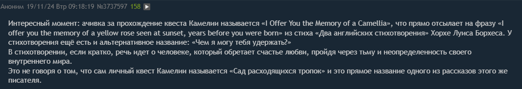 >>5198624 → Ты в треде первый день? Ещё на релизе было. Заодно и другое держи. У Камелии можно углубиться в суть истории Сада расходящихся тропок. Но в целом это отражает её судьбу: неважно какой альтернативный таймлайн (другая тропка) это была бы, судьба всегда сведёт её с Ровером.