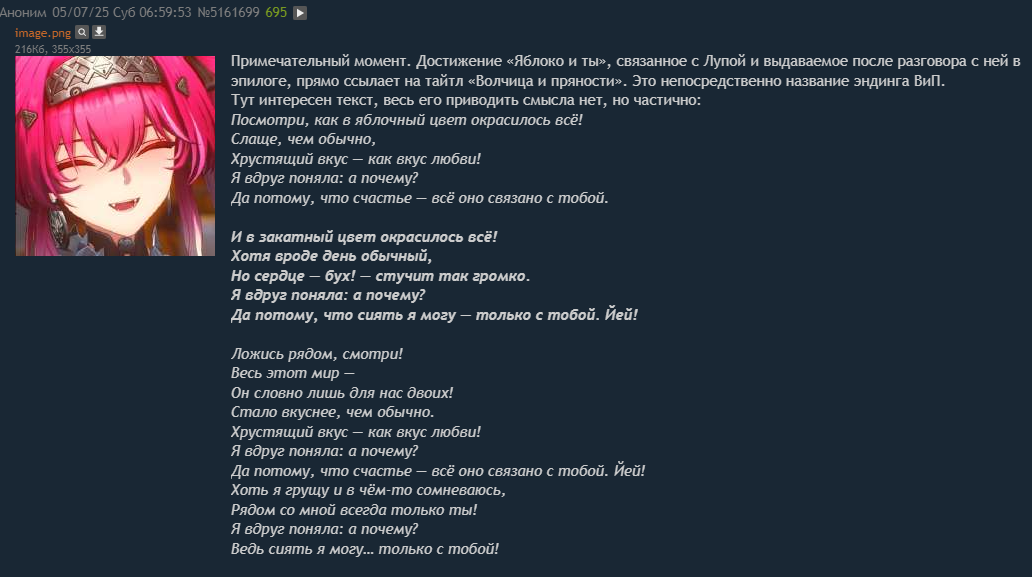 >>5199554 >Залупа просо не вызывает никаких еканьей в сердце За себя говори. Я прогрелся на Лупу только из-за еканья в сердце и тонны фанмейд контента с ней, которые просто с ноги вышибли мою стену "я кручу только августу".