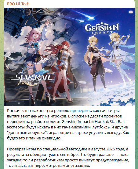 >МОСКВА, 11 июл - РИА Новости. Центр цифровой экспертизы Роскачества запустит исследование компьютерных игр на наличие скрытых манипуляций, используемых разработчиками для привлечения денежных средств игроков, сначала тестироваться будут приключенческие игры, в том числе Genshin Impact и Honkai: Star Rail, рассказали РИА Новости в организации. >"Центр цифровой экспертизы Роскачества приступает к масштабному исследованию по выявлению скрытых манипуляций, которые используют разработчики видеоигр, чтобы "подсадить" игроков и заставить их тратить больше денег. Сперва центр... будет тестировать приключенческие игры, в том числе Genshin Impact и Honkai: Star Rail. По планам исследовать до десяти игр, список проверенных игр будет постоянно пополняться", - говорится в сообщении Роскачества. >Там также отметили, что для анализа была разработана специальная методика, которая позволяет оценить, насколько в игре распространены скрытые манипулятивные механики для удержания внимания игроков и увеличения их денежных вложений. Всего эксперты выделили 16 основных способов, в том числе покупка "лутбоксов" (виртуальных контейнеров, при покупке которых геймер получает случайный игровой предмет) и участие во временных акциях, которые вызывают у человека страх упустить выгоду. >Тестирование игр начнется в августе, а первые результаты проверки будут опубликованы в сентябре, следует из сообщения организации. Genshin Impact - компьютерная онлайн-игра с открытым миром, выпущенная китайским разработчиком MiHoYo Limited в 2020 году. Распространяется бесплатно, но содержит внутриигровые покупки. Honkai: Star Rail - ролевая компьютерная игра с внутриигровыми покупками от разработчиков Genshin Impact. Выпуск игры состоялся в 2023 году на всех основных платформах, в том числе мобильных.