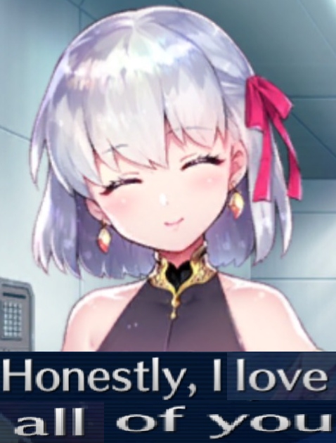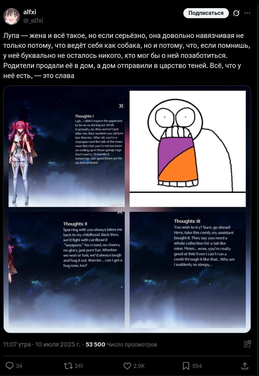 >>5200548 >И что теперь? Ждать, когда каноничную таки покажут? А то, что Катя там кого-то крипанула по юшкам это жозенький коуп. Ни разу не сказала люблю, засимпила Ровера буквально пару месяцев назад по таймлайну, в отличии от Шорки-Кумы, которые любят Ровера тысячи лет, короче говоря, очень слабенько. Даже Джинса, с учетом того, что она характером максимально на Ровера походит, больше тянет на жену. Никаких особых итерактов в Септимонте с ней я тоже не увидел, кроме того, что Катя резонирует с Ровером. Так как бы уже было такое с Шоркой и Кумой, только на куда более глубоком уровне. Ничего такого, что делало бы из нее прям жену с 2.2 так и не показали.