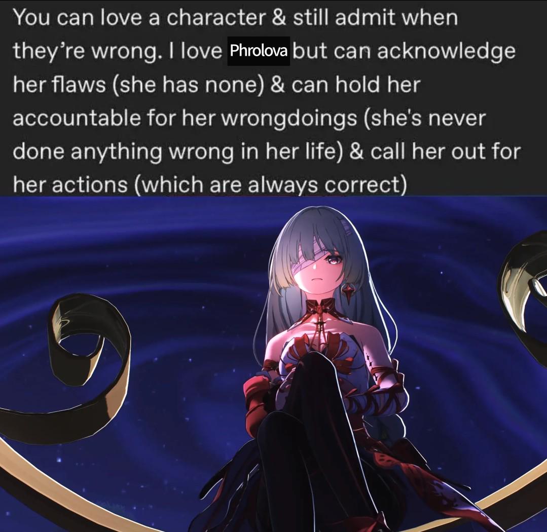 Заебали, шизики. Вот вам два положения из актуального лора (с учетом сливов): 1. Фролова убила минимум десятки тысяч человек во время оутбрейка ТД в Норфолле, нападенир на Хунжэнь и курирования операций фракцидусов, связанных с террором ордена (сжигание судов паломников, разъеб оппозиции, типа ученых, которых потом крыли Монтелли в своих бункерах, она же ответственна за контроль Тайдбрейкера, разъебавшего прошлый карнавал и, видимо, она же контролирует многих тасетов в океанах вокруг Ринасциты в целом) 2. Фролова делала это все (в том числе и в актуальном сюжете играет в свою игру, помогая Роверу) ради того, чтобы осуществить свою мечту утопию и позволить частотам погибших и дорогих ей людей воскреснут посредством сил левиафана, с помощью которых она сможет скрестить мир материальный с ее личным Соноро. Вот ради манямирка она, ориентировочно, столько убивала и столько страдала с фрактами.