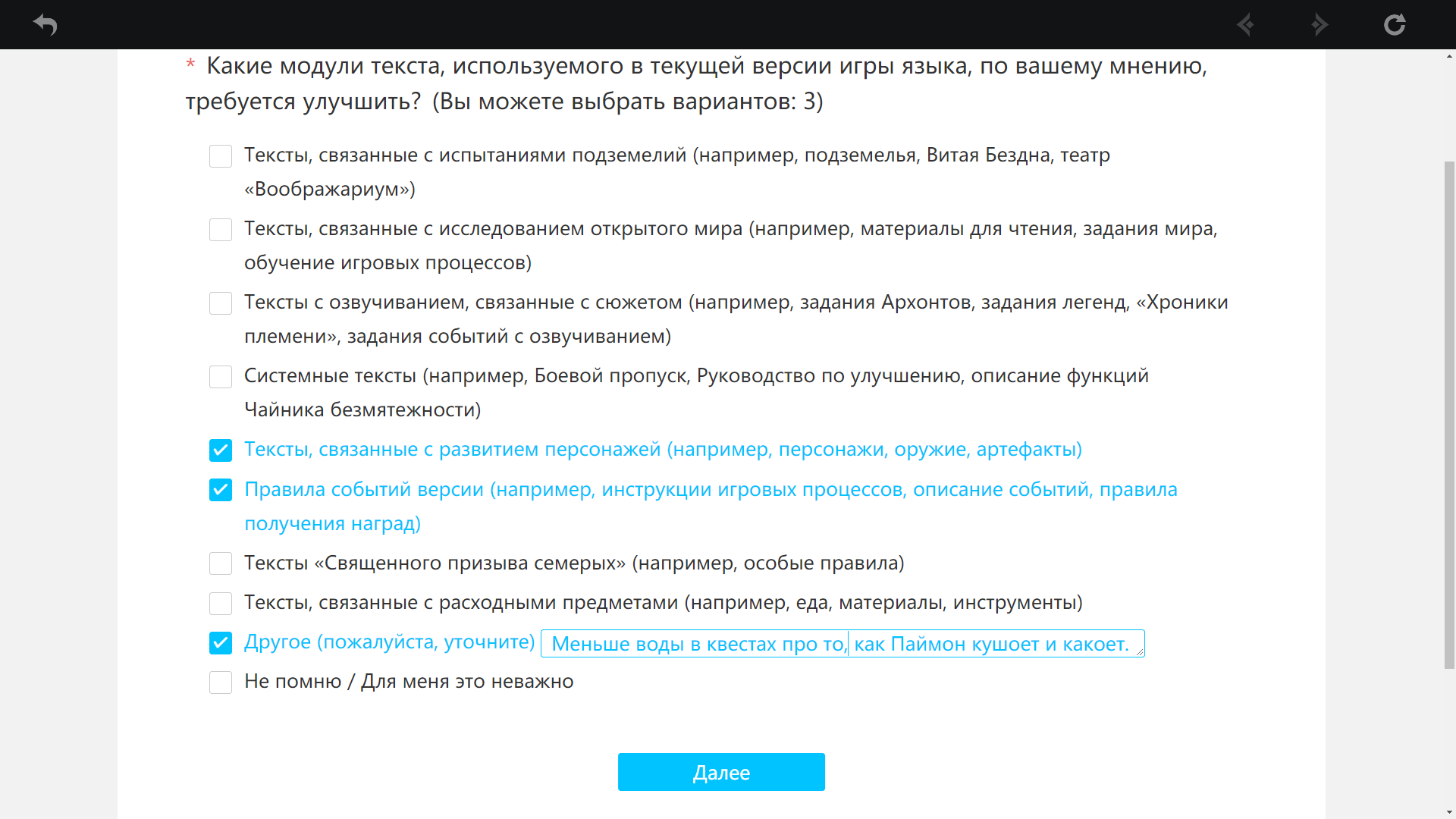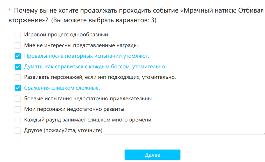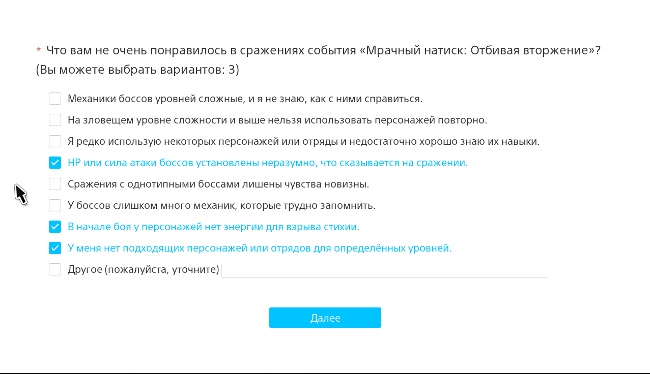 Челы, я тут разгадал паходу ляоалгоритм по опросам. Кароч если выбирать опции, что ивент не понравился, он дальше спрашивать нихуя не будет, а вот если выбрать среднюю опцию, то он будет развернуто спрашивать, что именно не понравилось. Так вот там в опросе про надриск я впервые увидел вариант ответа о том, что количество ХП у врагов неадекватно большое, или что типа у меня нет персонажей под этих боссов. Раньше такое только самому вбивать надо было. Надеюсь это знак того, что многие реально жалуются по этому поводу. И ляо еще больше надует хп боссам.