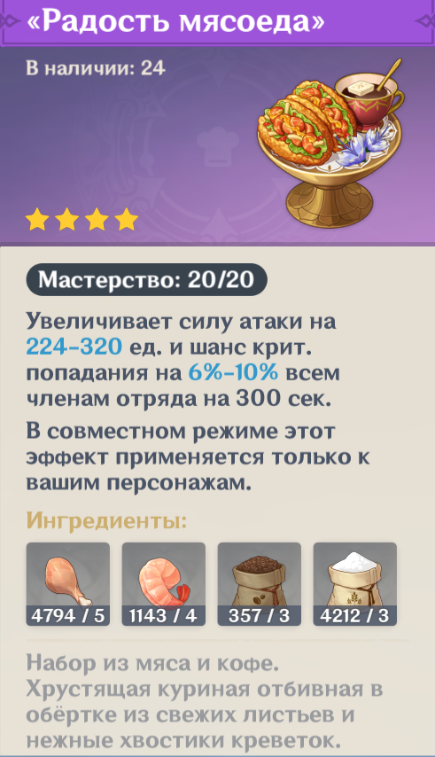 >>5200093 А блин, я думал там на восстанову и криты хавчик, а там просто бесполезная хрень на критшанс. Зачем она когда есть филолетовые рецепты, которые дадут чуть меньше крита, но еще и атаки зальют?