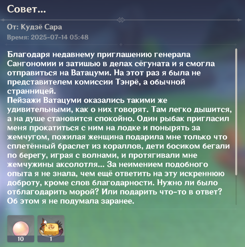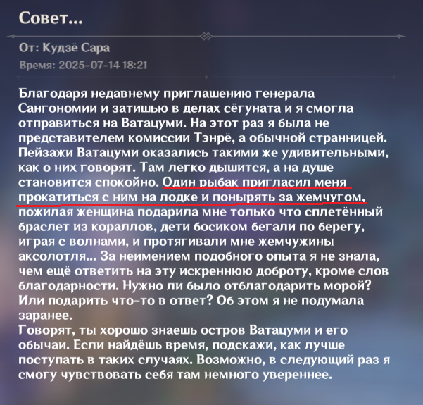 Ах, точно, у неё же ДР... Ну ладно, тогда ради Сарочки можно и попридержать заготовленный... Эх, вот бы с ней покататься на лодки и понырять за жемчугом. Ну вот почему я не родился рыбаком на Ватацуми?!
