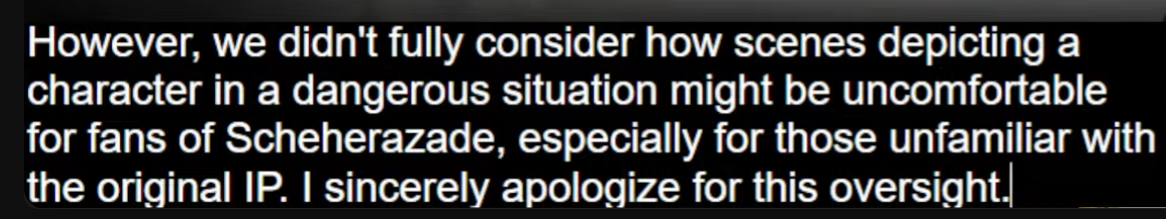 Откровенные изображения Шахерезады Что касается изображения Шахерезады, то, по мнению одних, оно напоминает атмосферу оригинального произведения, другие выразили недовольство сценой, в которой ее мучают таинственные монстры, называемые гоблинами. Мы понимаем, что, особенно для фанатов "Шахерезады", это могло бы сильно расстроить, и мы от всего сердца разделяем ваше разочарование. Учитывая общий ход событий, направленность существующего набора сюжетных линий не позволяет нам исключить гоблинов в целом. Однако мы предоставим дополнительное изображение, на котором Шера изображена без гоблинов, для специальной иллюстрации, установленной на главном экране.