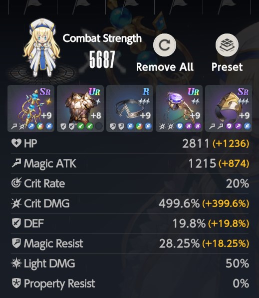 Вот кстати чё про складывание циферок и причуды местного интерфейса вспомнил, что может быть неочевидно для невнимательного новичка. Глядя на эти статы, кажется, что у Жрицы 1215 атаки + 874 приятно выделенного жёлтым бонуса, да? То есть всего почти две тыщи сто? А вот нихуя, у неё 1215 атаки. Серые цифры слева указаны уже с учётом чисел справа.