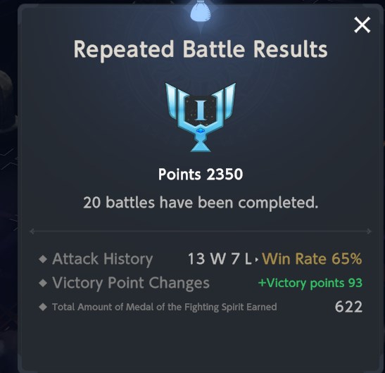 Я правильно понимаю за местное аутичное ПвП? Значит, за победу дают/отнимают рейтинга одинаково, хоть по одной битве играть, хоть по десять. А медальки - перемножаются, при этом за поражение дают сильно меньше. То есть можно поставить Виггла в камикадзе-атаку соло, слиться куда-нибудь в Голду 3, а потом поднимаясь обратно набить х10 битвами медалек на почти халяву? Копию на Лувенсию хочу, а у меня не хватает.