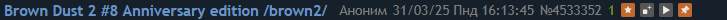 >ОБЗОР ПРЯМОЙ ТРАНСЛЯЦИИ 2.0 ANNI Примечания разработчиков: https://www.browndust2.com/en-us/news/view?id=7148 Коды: 2025BD2MARCHLIVE, 2NDANNIVERSARYBD2, HAPPY2025BD2DAY Бесплатные призы: 3 случайных билета на 5*, 35 билетов на розыгрыш, 20 билетов на выборочный розыгрыш и многое другое (смотрите по почте) >Летний набор -Wilhelmina Fated Guest. В нем есть то, что нельзя показывать в эфире. -Летняя Вильгемина - это Celia (усиливает свои собственные цепи). -Летняя Рефи: +Свойство Dmg - Расход SP -Зенит: Одиночная метка цели, которая усиливает урон, наносимый цепью цели. -Эклипс невеста: простой навык нанесения урона AoE, имеет уникальную схему нанесения урона. -БАТересса будет запущена ДВАЖДЫ (в июне и августе), чтобы никто не пропустил ее. >Основные моменты -Новая мини-игра "Охотник на монстров". Вы сражаетесь с демонами (в режиме реального времени), используя приемы, специальные навыки, блоки и т.д. В игру можно играть в кооп. На разработку ушел год. -Теперь вы можете пополнить счет в их новом интернет-магазине (скидка 10%). -Множество отличных характеристик: возможность начать с начального уровня в FH (и получить все награды за предыдущий уровень), повышение уровня персонажа в одно касание до 1 уровня>100 и т.д. -Новый пропуск новичка. Дает 1 NH Небрис, 15 слезинок, 12 билетов на выбор и т.д. (Также доступны для существующих игроков). --12 билетов на выбор. Билеты можно потратить по своему усмотрению на 12 фиксированных костюмов в специальном баннере. В нем есть Диана / Хелена, так что новые игроки больше не заперты. - Постоянно доступны прошлые welfare. Существующие игроки могут повторить миссии, чтобы получить 1500 GT за единицу. -MyRoom -> Капитальный ремонт в myHouse -Glupy Diner Moods: случайные текстовые сообщения и настроения от гостей. Нажимайте на них, чтобы получить дополнительные награды, например монеты MyRoom deco. --Glupy Diner lightning и BGM будут настраиваться в зависимости от вашего местного времени, как в играх с покемонами. >Платный скин -Получено с помощью системы счастливого розыгрыша -Минимальная стоимость - 8 баксов (первые 2 оплаченных билета после 2 бесплатных), максимальная - 50 баксов (очень жаль). Другими призами являются билеты на розыгрыш. -П.Скины поставляются с интерактивной заставкой -Частота, по-видимому, составляет один раз в ~ 2 месяца (следующий - в августе)