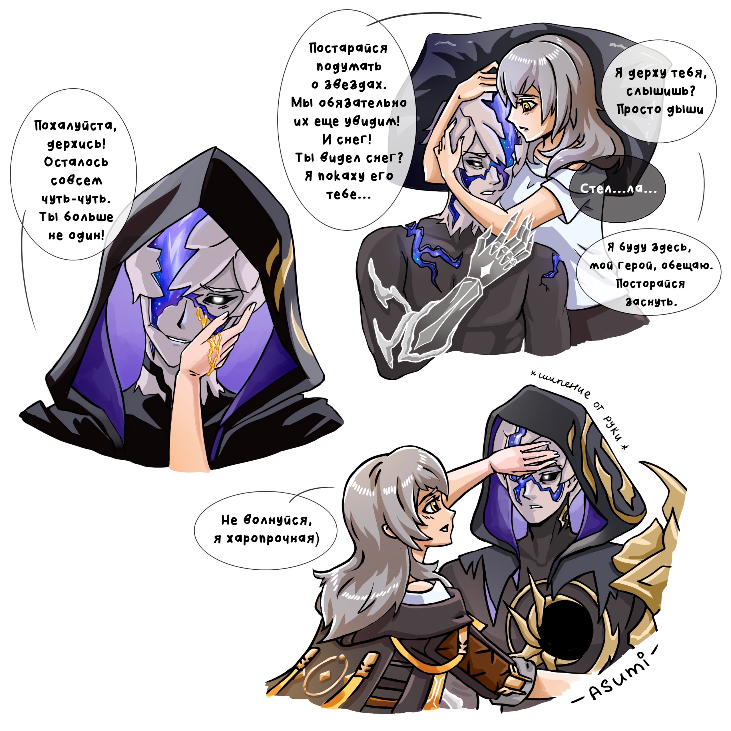 Если это не «Собери себе гарем жён», то зачем тогда женские персонажи так романтически и физически сближены с Ровером, а мужские персонажи — на задворках как в геймплее, так и в сюжете? Люди играют в эту игру не только ради истории. Речь про персонажей и ситуацию с Кантареллой… Она сама за себя говорит, что это за игра. Почему в гача-играх так мало мужественности? Почему некоторые инц* так ненавидят свой пол, что даже не будут крутить баннер с мужскими персонажами?