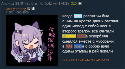 >Электро попал с обычным челом в ловушку и оказался заперт около бездны Ну чел не обычный был, а предок Е Лань, который каким-то йоба-магом был и лидером отряда из числа людей, что в Разломе застряли. Да и вообще это как раз таки и был самый драматичный момент, который меня смог на эмоции пробить, так что у меня никаких претензий к этому нет. Алсо, в Разломе у Сяо тоже колпак быстрее тёк, чем у остальных застрявших челиков. Так что есть вероятность, что на сущности в виде Якш эманации йобы из Разлома действуют сильнее.